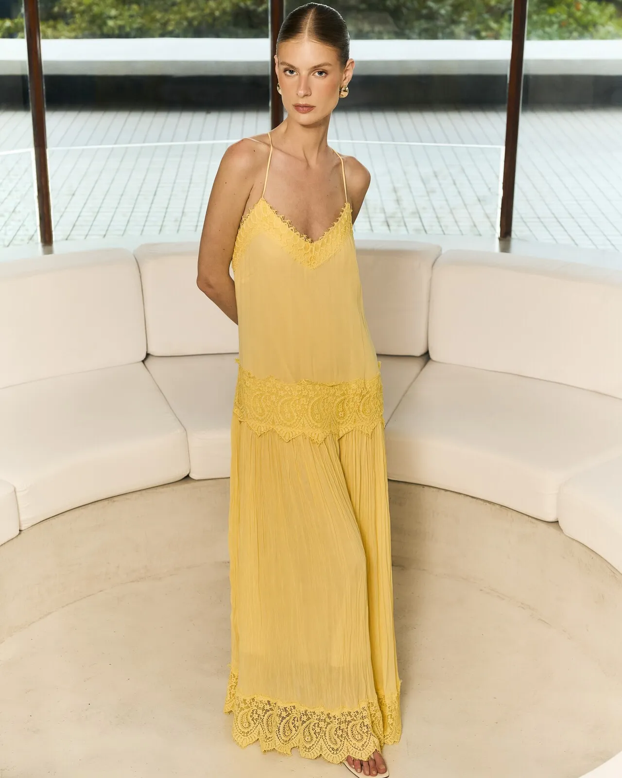 Vestido Longo Juju Norremose,Anne Fernandes. Vestido longo amarelo, tecido tarquinado com aplicações de renda, possui alças finas, decote V, fechamento em zíper na parte das costas, modelo fluido, possui forro. Não acompanha outras peças. Tecido delicado.