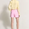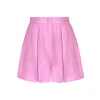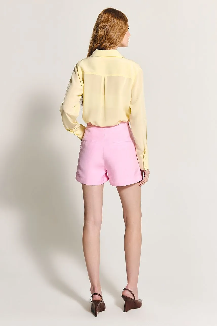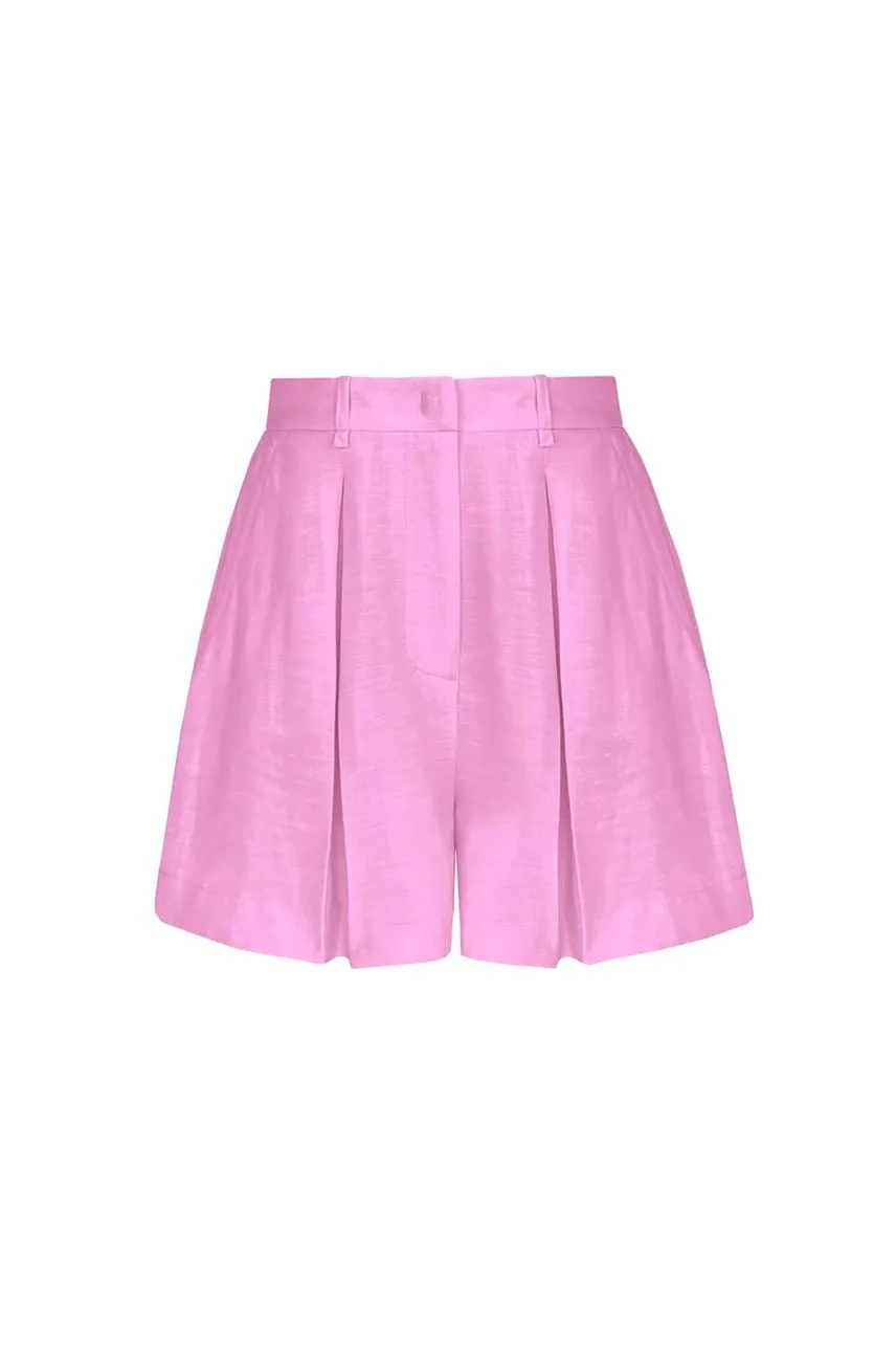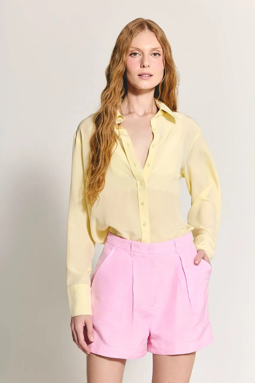 Bermuda em misto de linho com modelagem regular e pregas frontais e bolsos sem função nas costas. Possui fechamento frontal por zíper, gancho e botão de segurança.