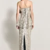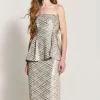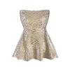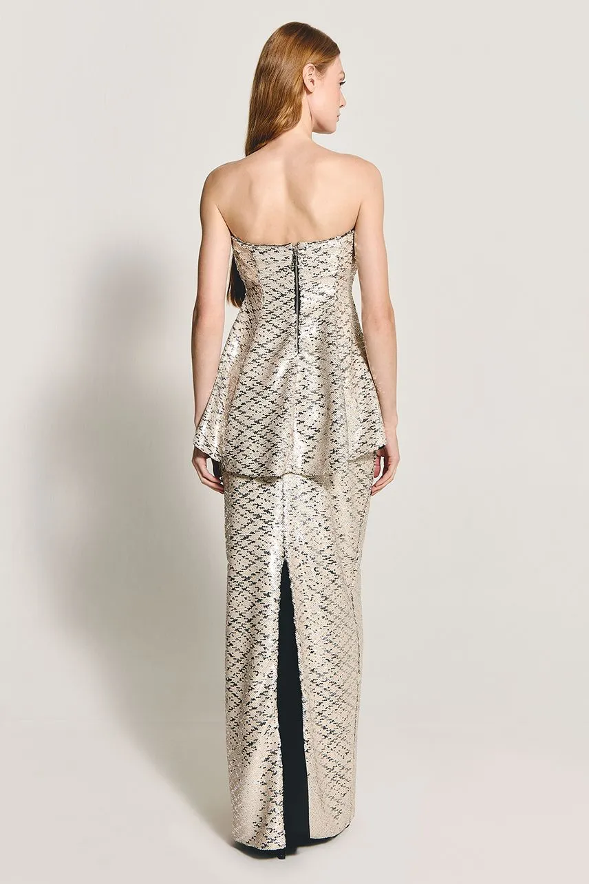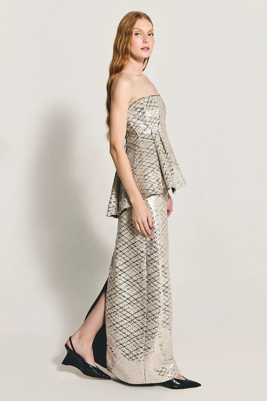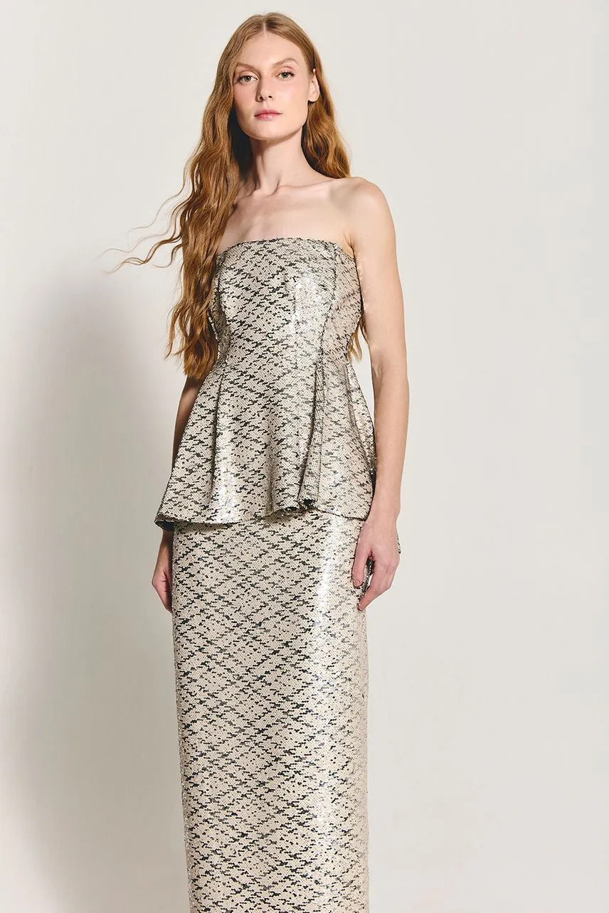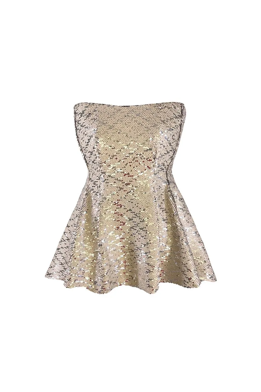 Blusa sem alças em paetê especial com modelagem regular e levemente acinturada. Possui fechamento posterior por zíper de metal.