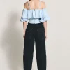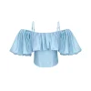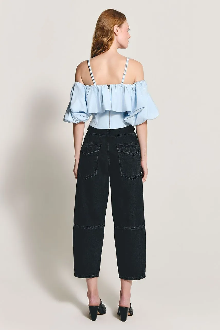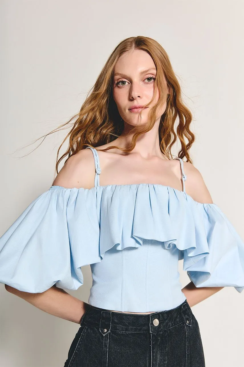 Blusa em tricoline sarjado ombro a ombro com alça removível. Possui babado com franzido por todo decote, corpo estruturado por barbatanas e fechamento posterior por zíper de metal e puxador personalizado.