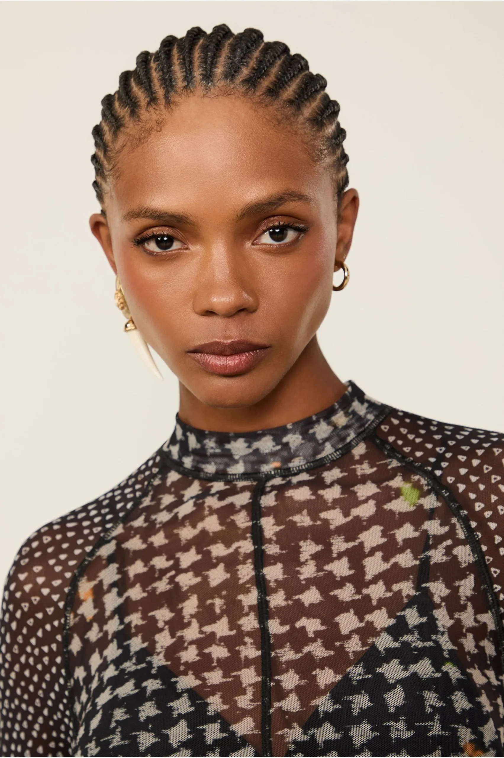 A Blusa de Tule com Mix Estampado possui mangas longas, comprimento clássico, gola alta e detalhes pespontados. A transparência do modelo revela a pele de forma discreta e feminina.