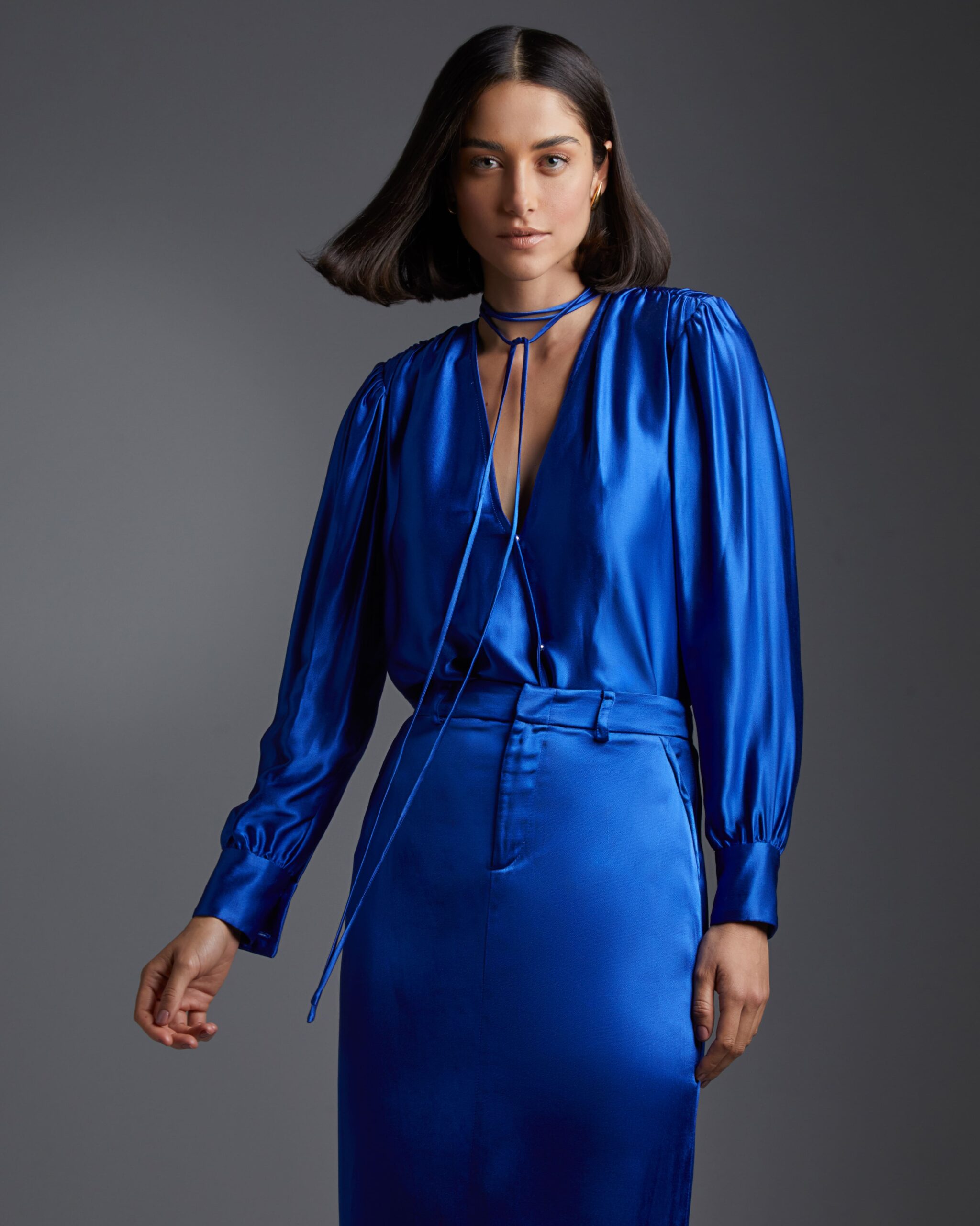 A blusa Lais é confeccionada em cetim, tecido com acabamento liso, brilhoso e acetinado. A peça apresenta modelagem leve e solta, decote V profundo e detalhe com amarração no pescoço, pode-se ousar na criatividade do mesmo, proporcionando um visual sofisticado e elegante. Possui mangas compridas com botões forrados, ombreiras com franzidos nos ombros e acabamento pespontado. Contém trespasse anterior com fechamento por botões de pressão e amarração interna.