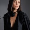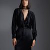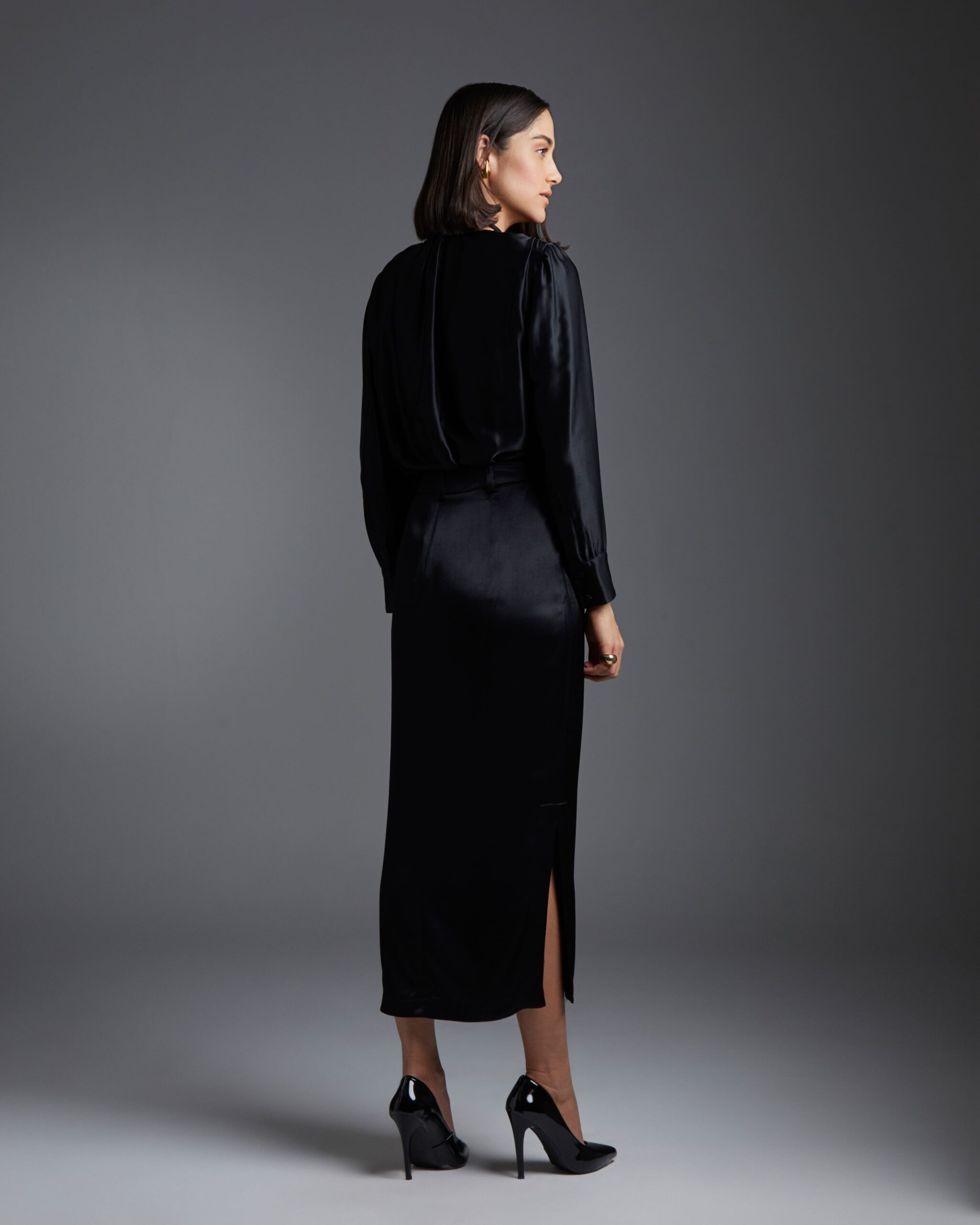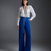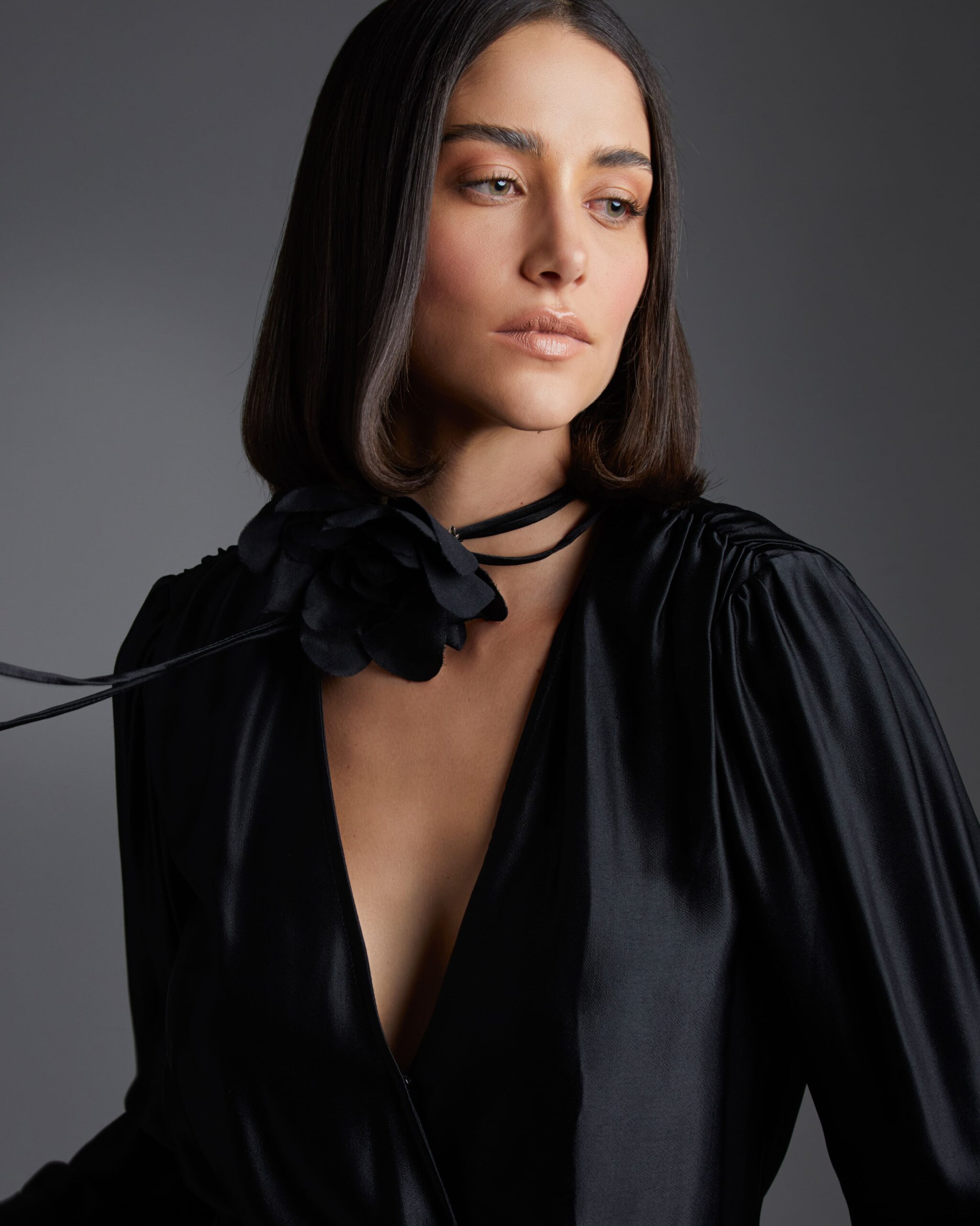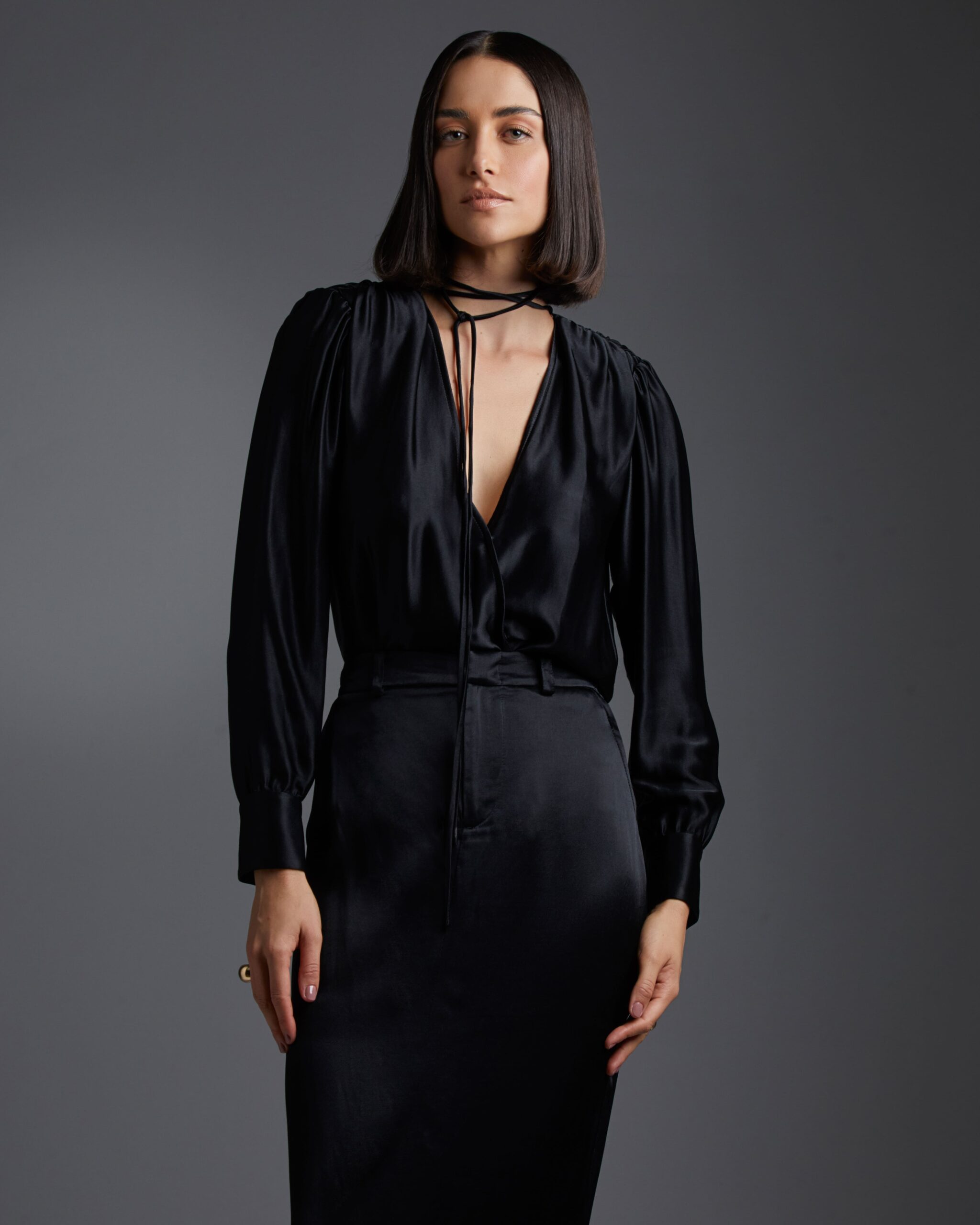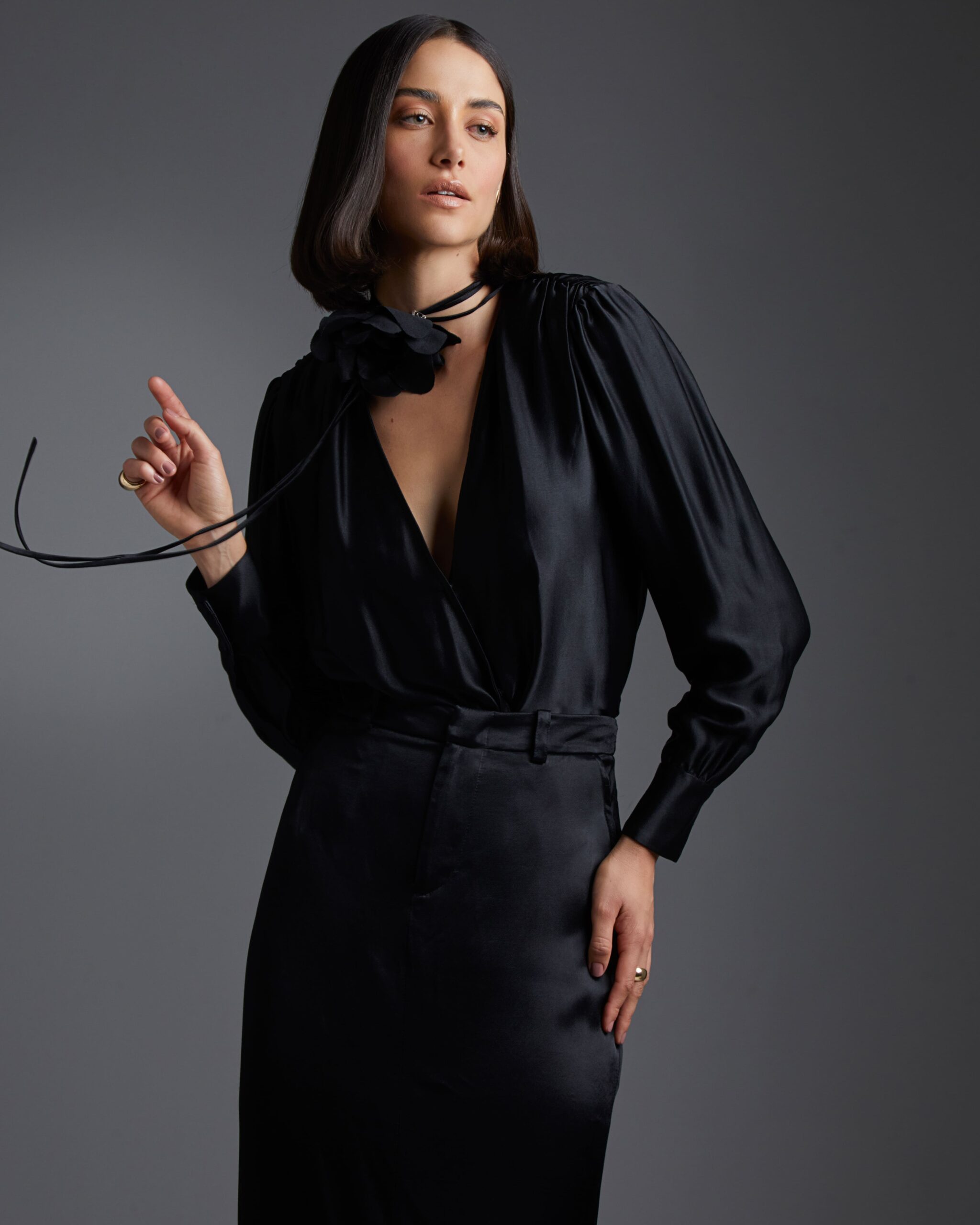 A blusa Lais é confeccionada em cetim, tecido com acabamento liso, brilhoso e acetinado. A peça apresenta modelagem leve e solta, decote V profundo e detalhe com amarração no pescoço, pode-se ousar na criatividade do mesmo, proporcionando um visual sofisticado e elegante. Possui mangas compridas com botões forrados, ombreiras com franzidos nos ombros e acabamento pespontado. Contém trespasse anterior com fechamento por botões de pressão e amarração interna.