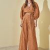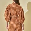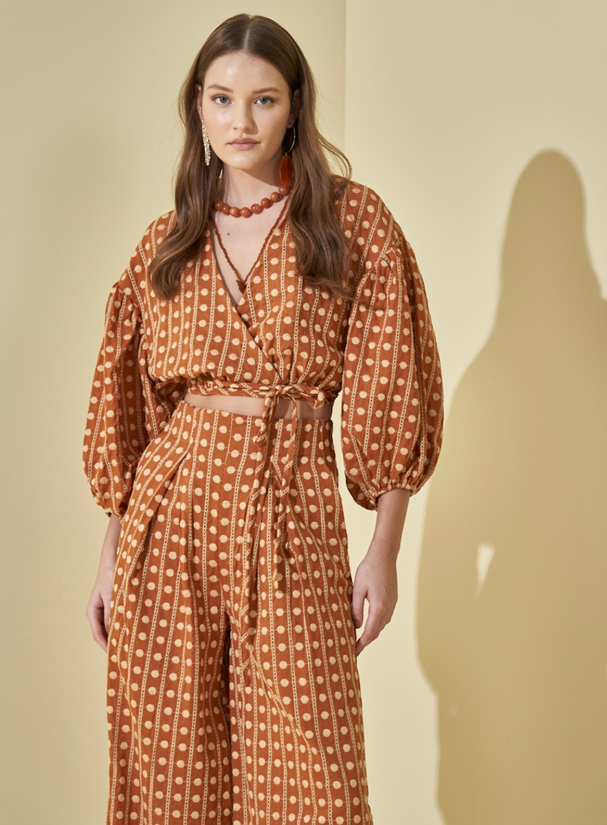A peça possui transpasse, faixa dupla para amarração, mangas bufantes com elástico na barra, comprimento cropped e shape justo.