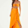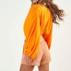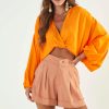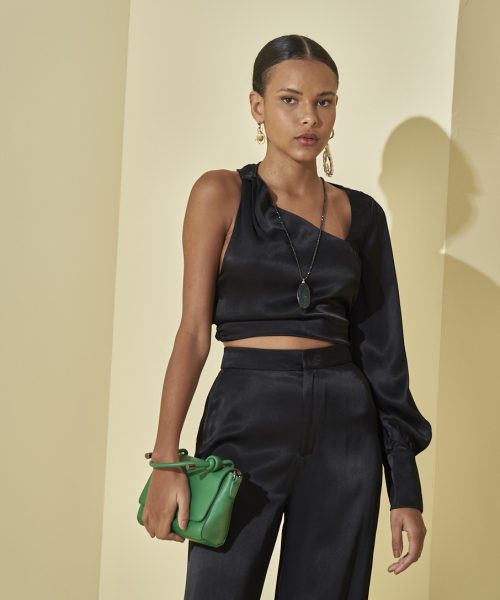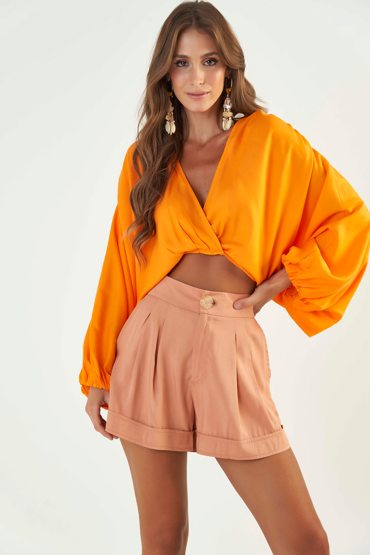 A peça possui transpasse frontal, mangas longas e amplas com elástico nos punhos, comprimento cropped, modelagem fluída, recorte franzido no ombro, shape solto e caimento reto.