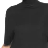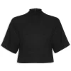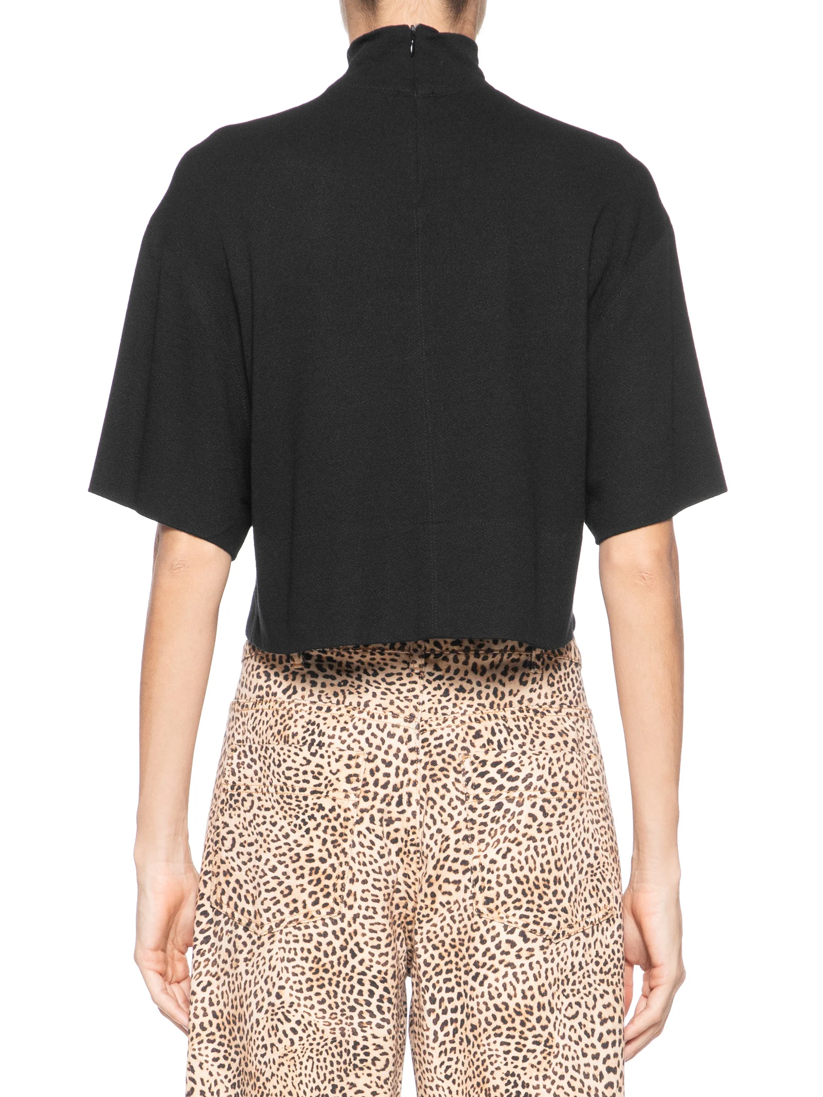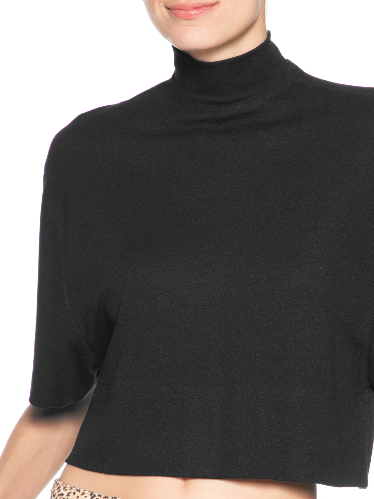 A blusa preta é confeccionada em malha de crepe com média elasticidade. A peça solta ao corpo possui gola alta, mangas curtas, comprimento *cropped, e fechamento posterior por zíper invisível.
