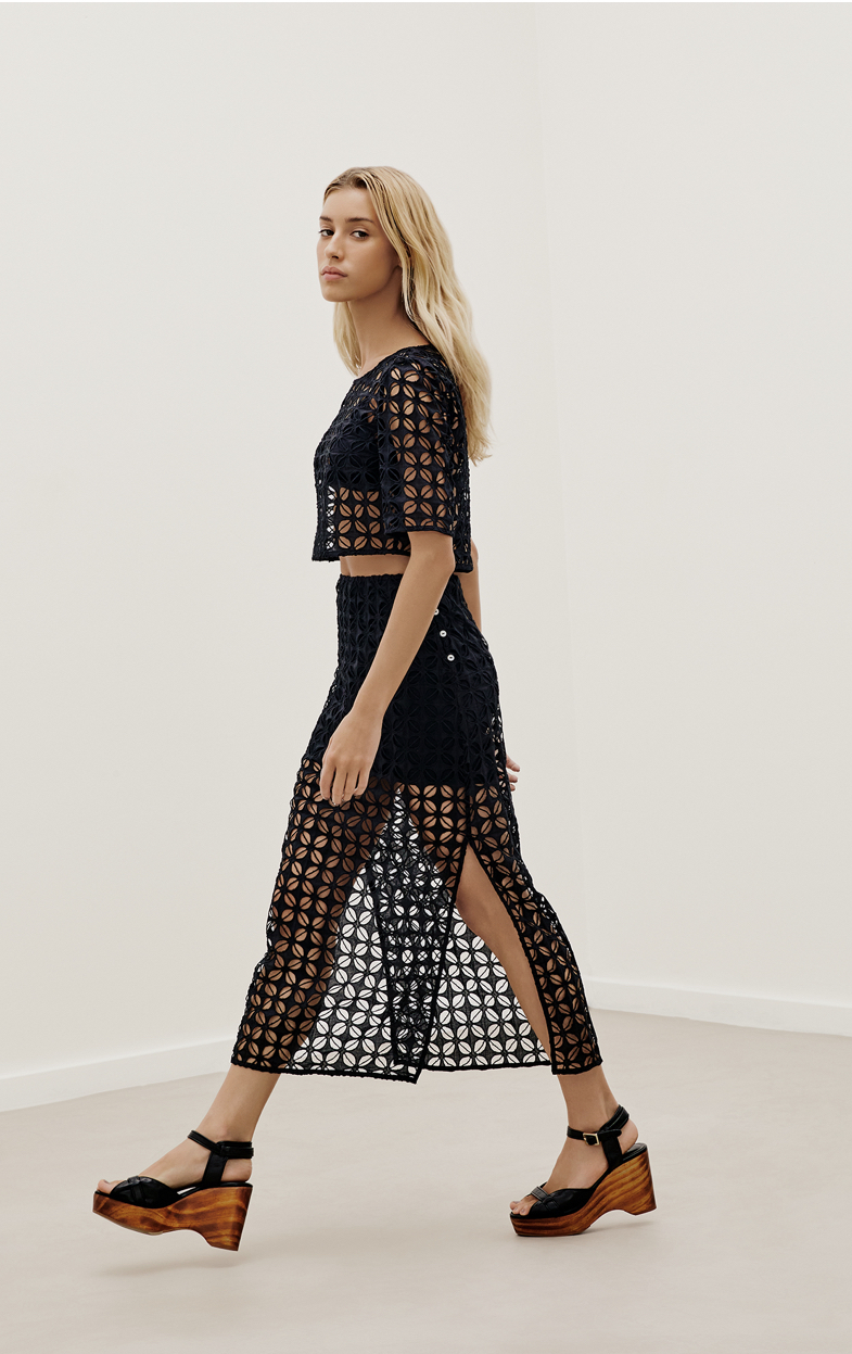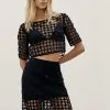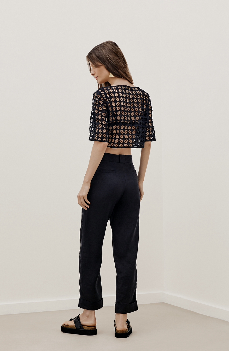 Blusa curta em Laise vazada com top triangular em ambra black com regulador e fecho.