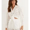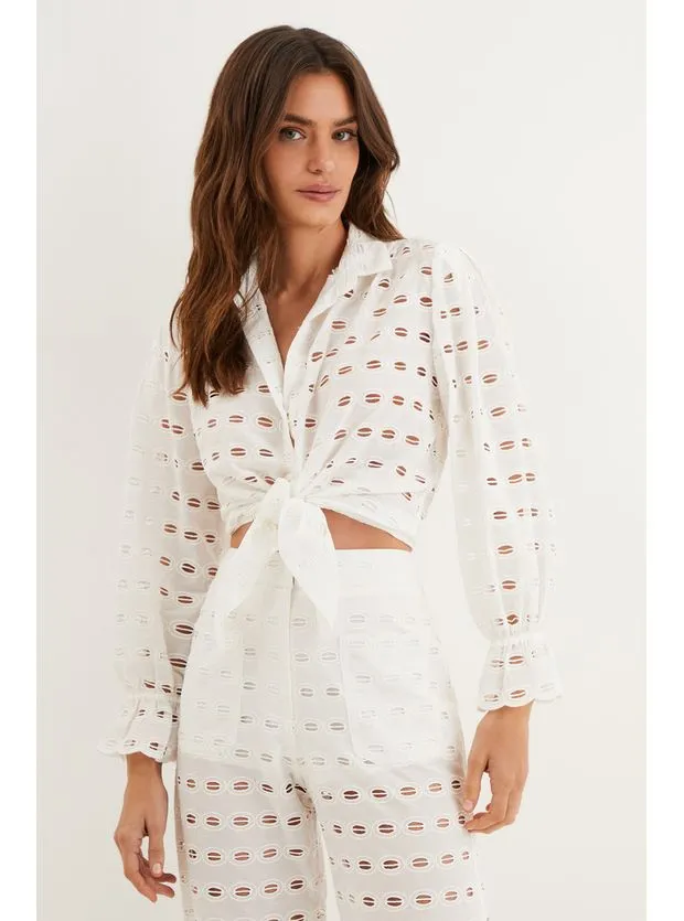 Versátil e atemporal, a blusa branca de manga comprida Zita é uma peça que pode ser usada com shorts, calças ou saias da coleção. Leve seu look do dia para noite com flats, sandálias altas, bolsas e outros acessórios ViX. Uma exclusividade do ateliê ViX, a laise Olho tem recortes arredondados em padrões simétricos. – Mangas levemente bufantes – Elástico no punho – Amarração na frente e botão – Não acompanha top de malha Detalhes feitos à mão no ateliê ViX Paula Hermanny e