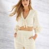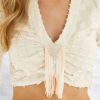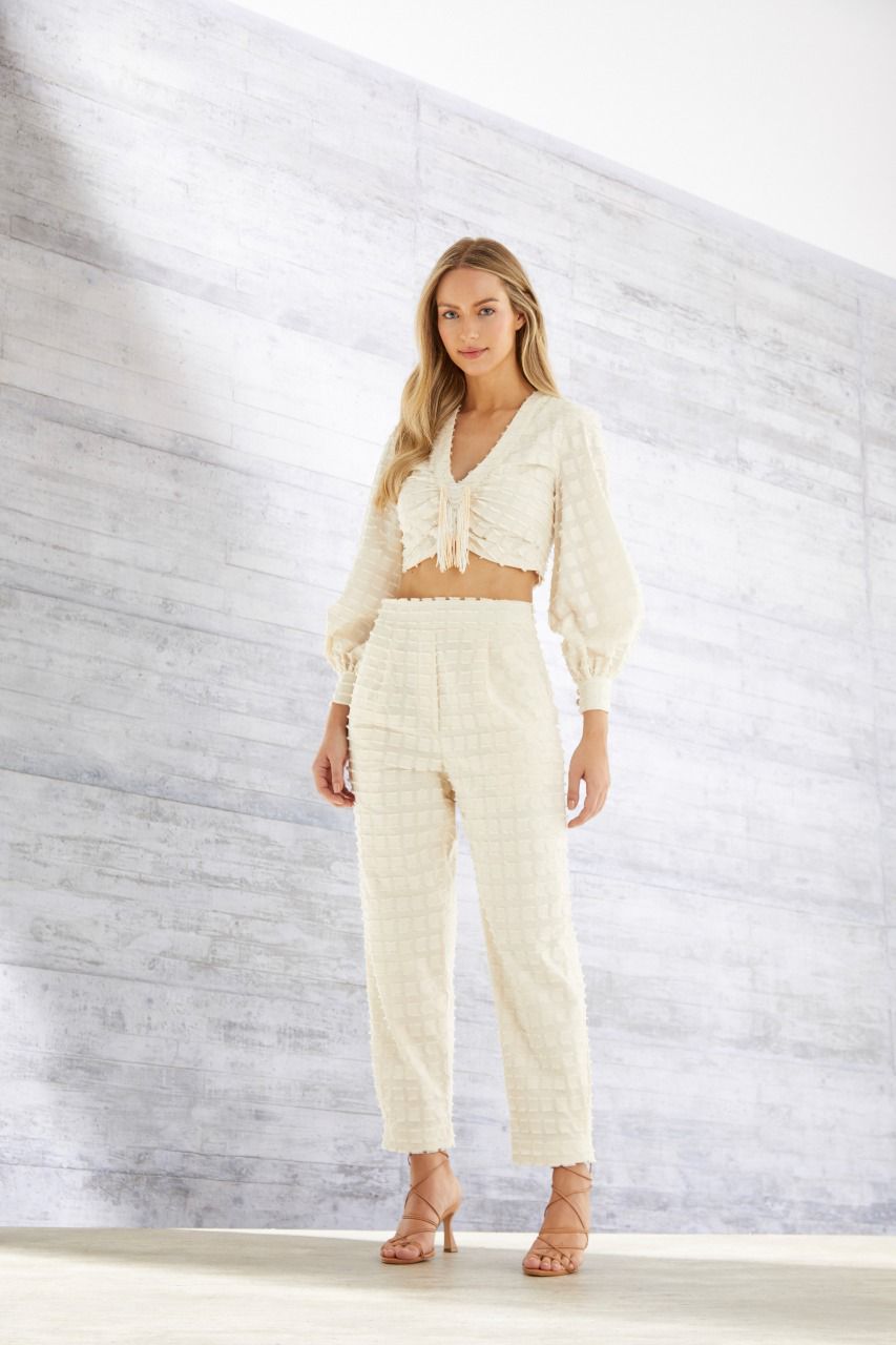 A blusa off white é confeccionada em algodão texturizado. Possui detalhes em franja no decote, proporcionando ao look um visual retro-chic. A peça apresenta comprimento cropped, mangas longas e soltas, decote em V e acabamento pespontado.