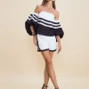 A blusa Marcele é confeccionada em tricoline. A peça off white apresenta modelagem solta com maxi mangas bufantes e listras na cor azul marinho, proporcionando um visual clássico e no estilo navy. Possui decote reto e tomara que caia e acabamento pespontado.