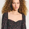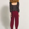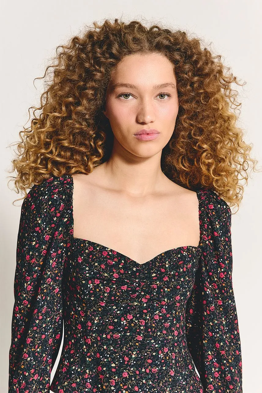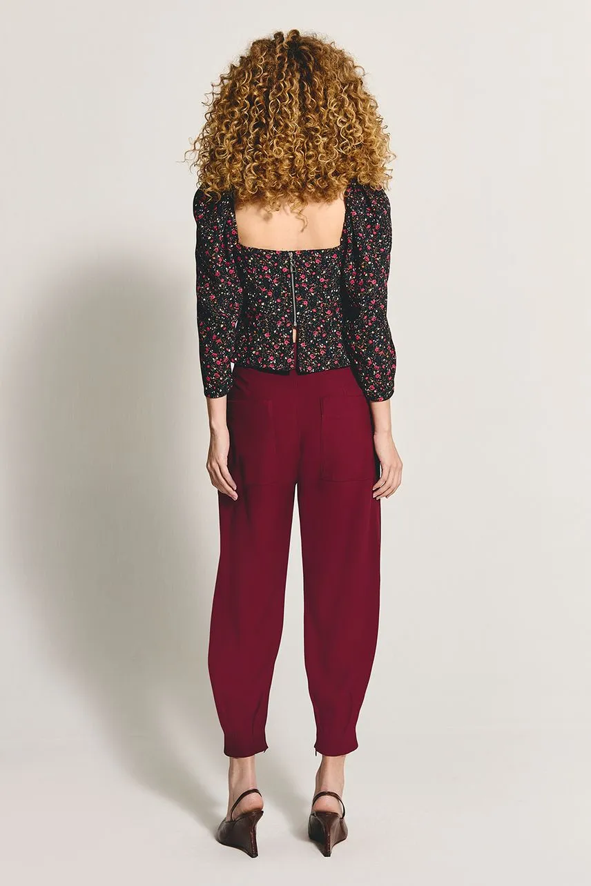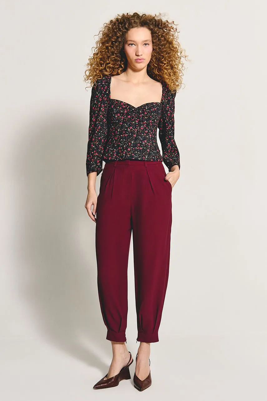 Blusa em crepe de acetato com modelagem regular. Possui manga e busto franzidos com fenda costas abaixo do zíper.
