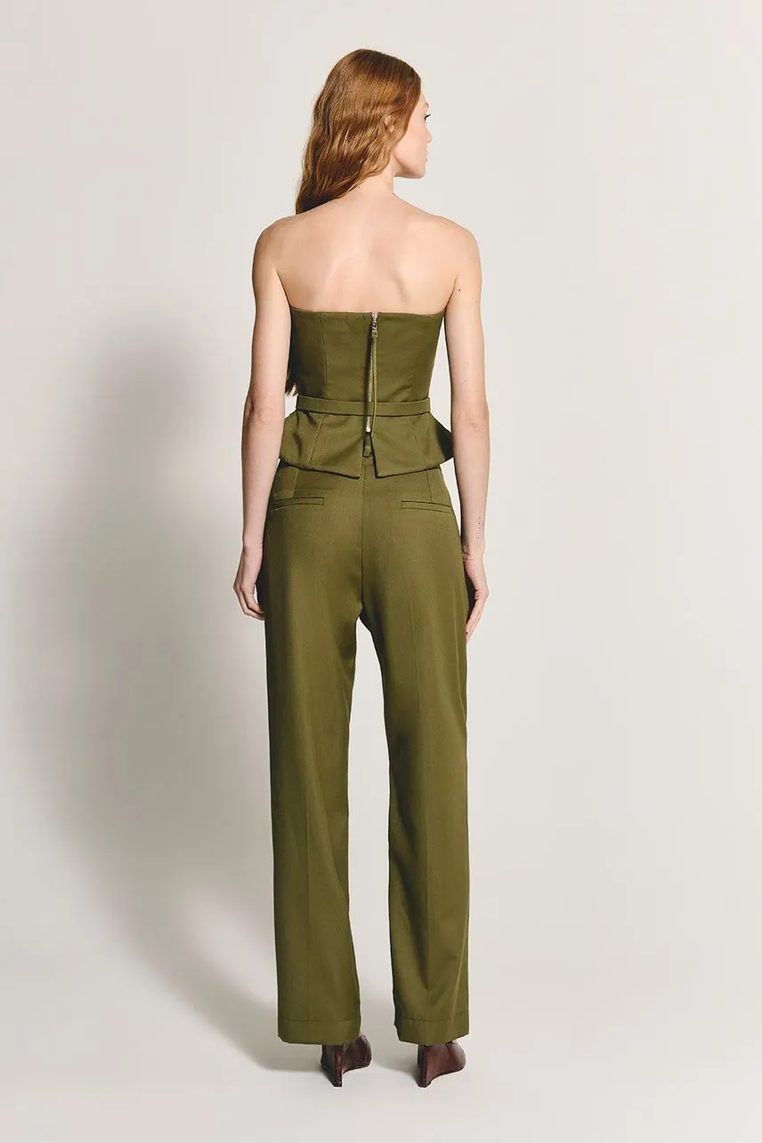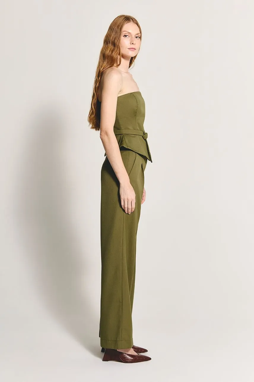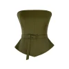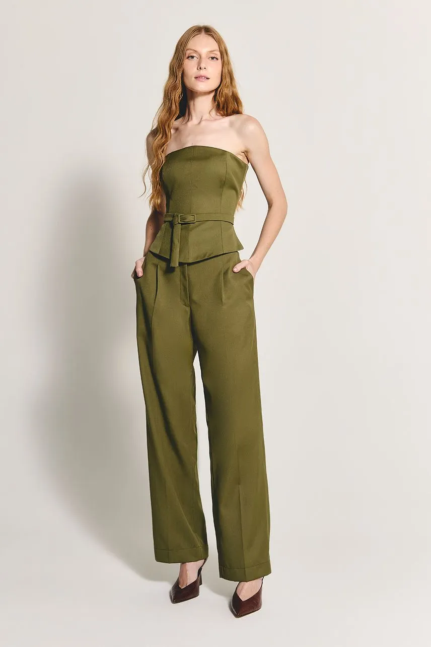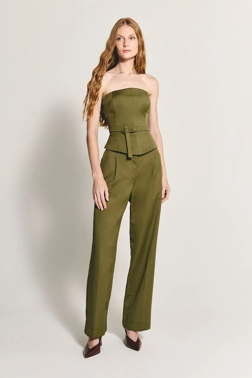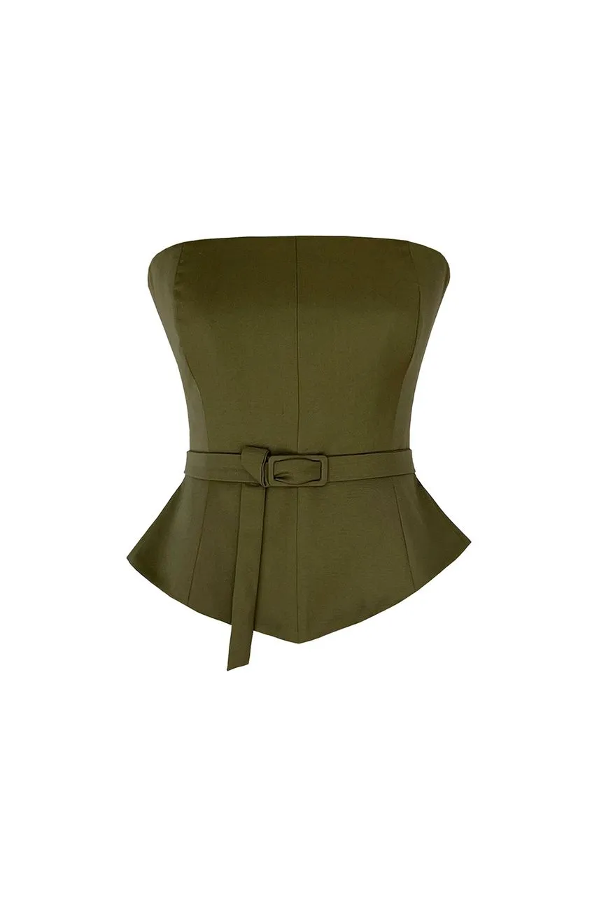 Blusa sem alças em lã leve com modelagem acinturada. Possui cinto avulso do próprio tecido e fechamento posterior por zíper de metal destacável.
