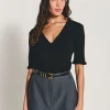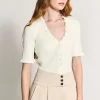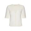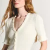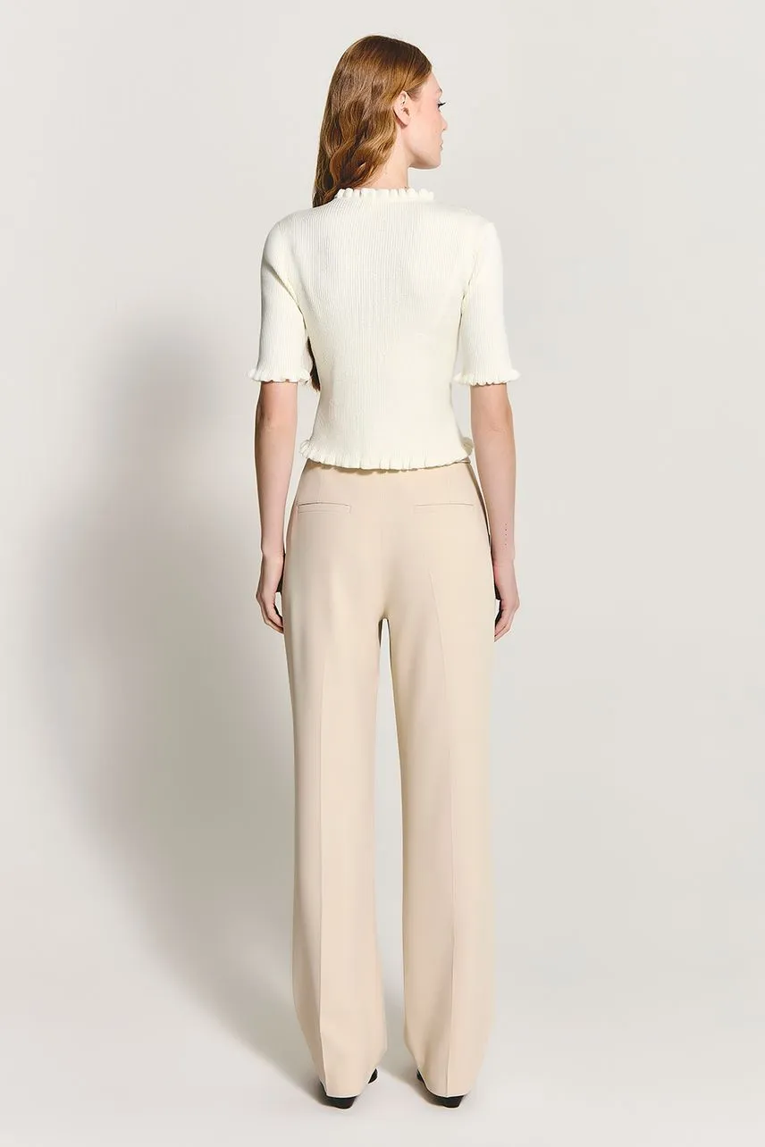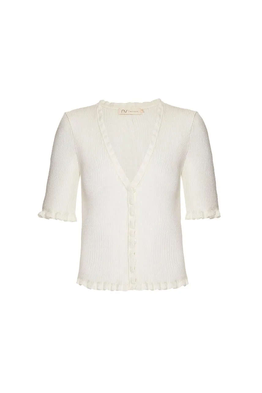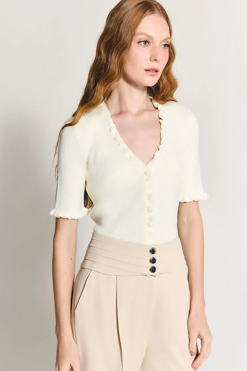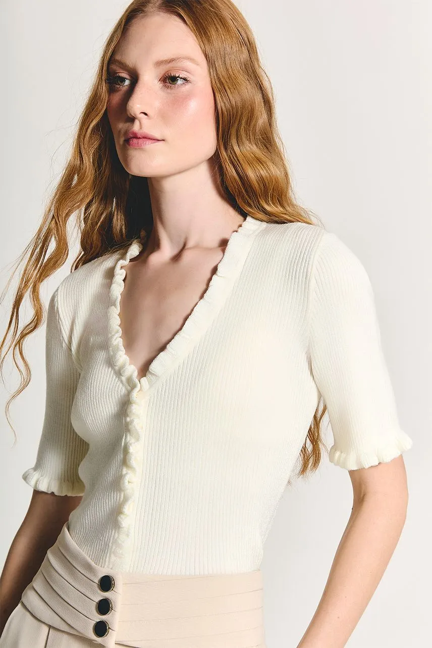 Blusa de manga curta em tricot canelado e acabamentos em frufru. Possui fechamento frontal por botões