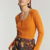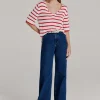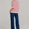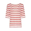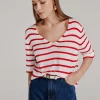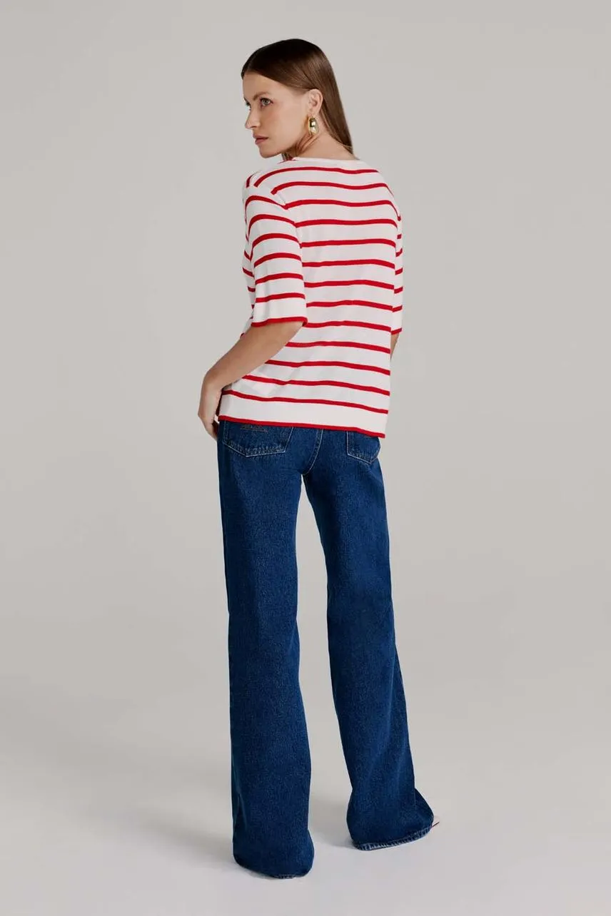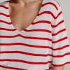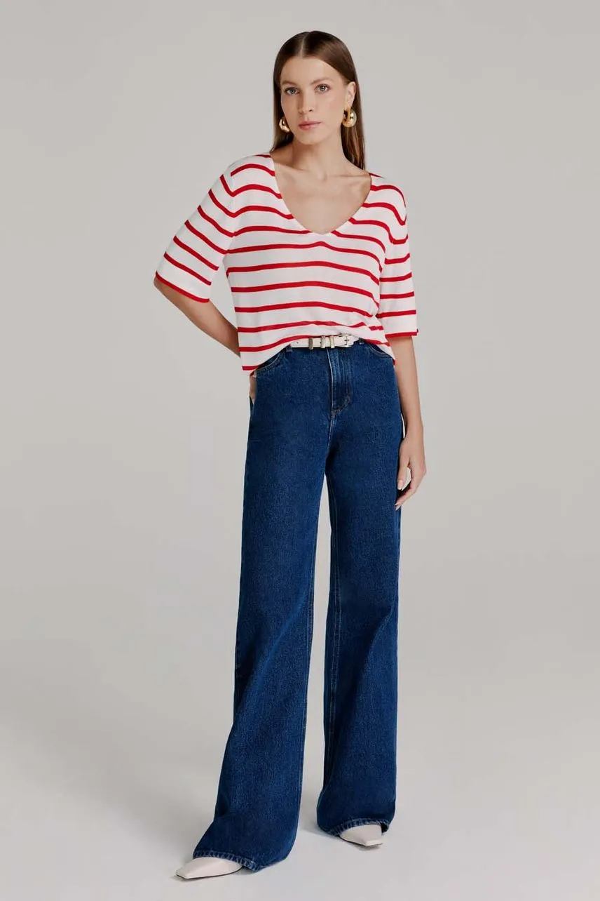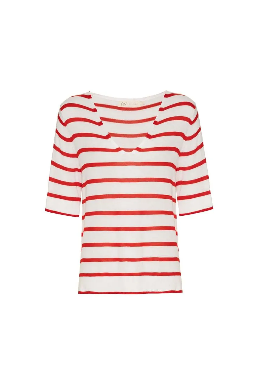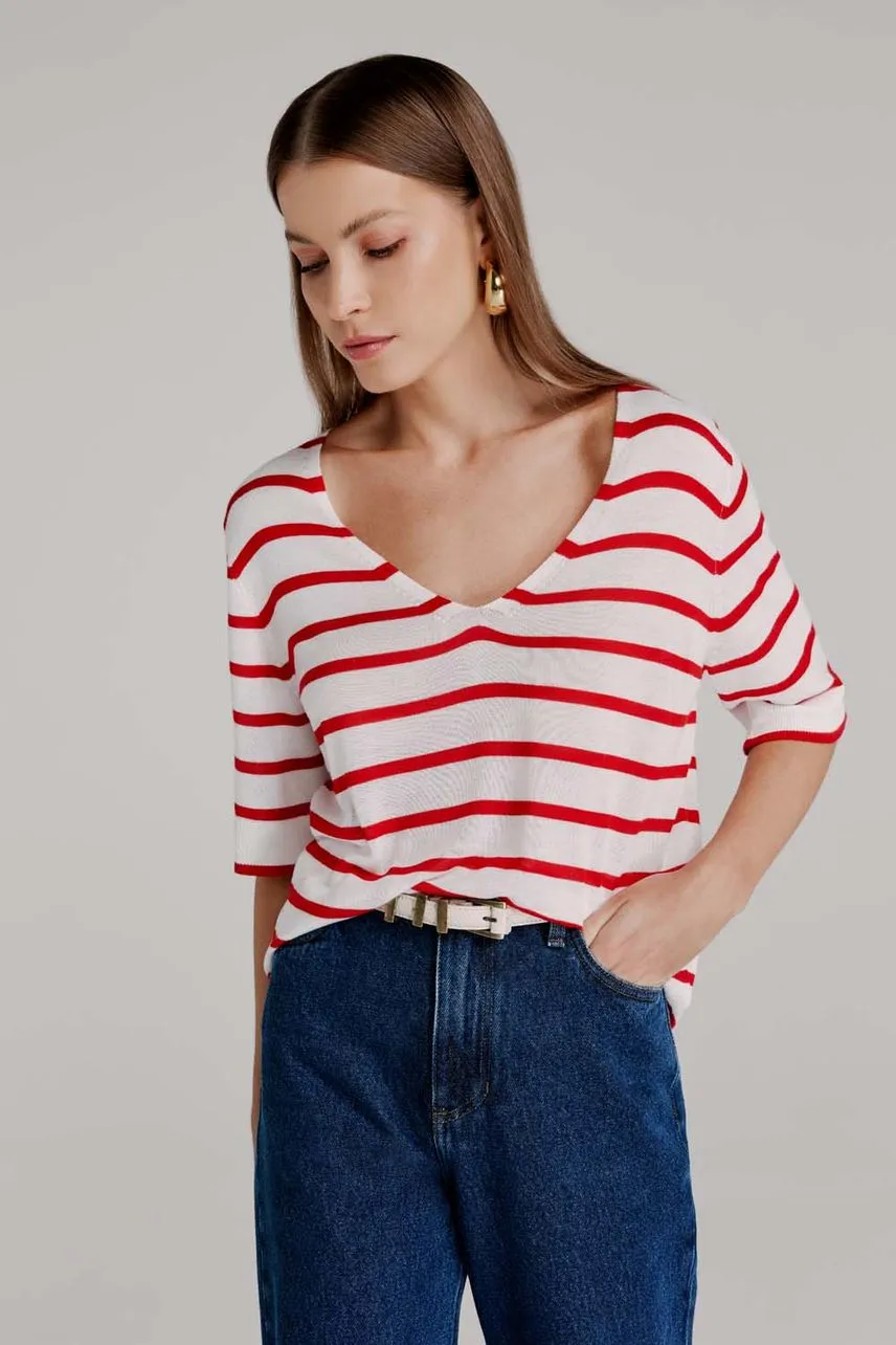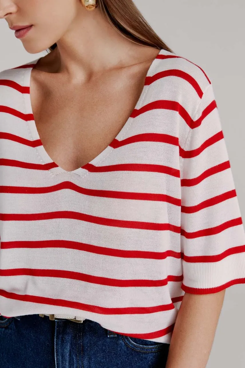 Blusa listrada em tricot com modelagem regular, manga curta e decote em V.