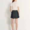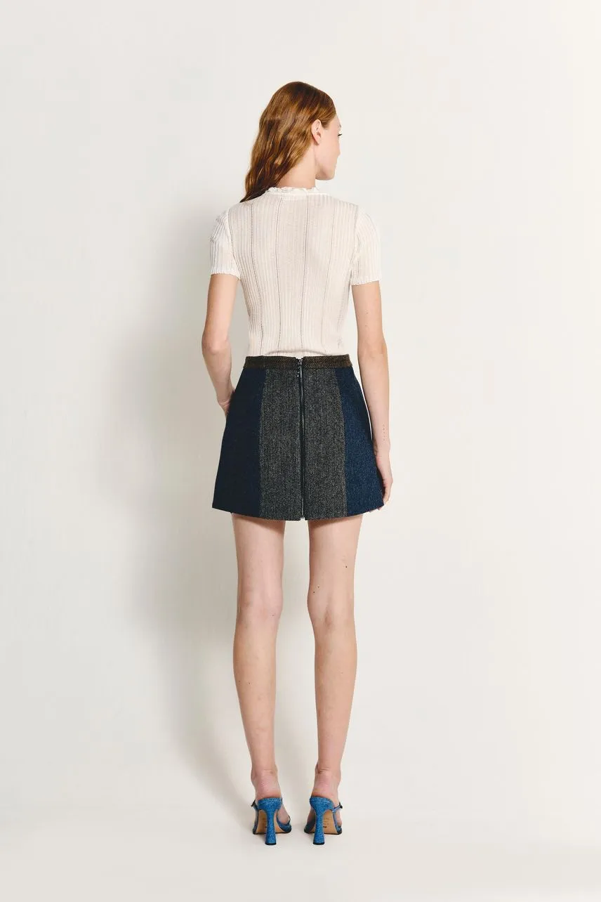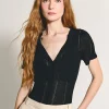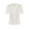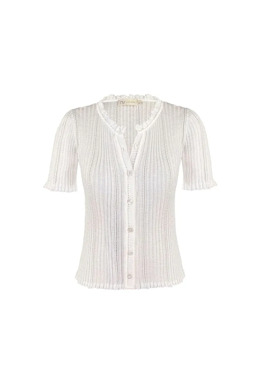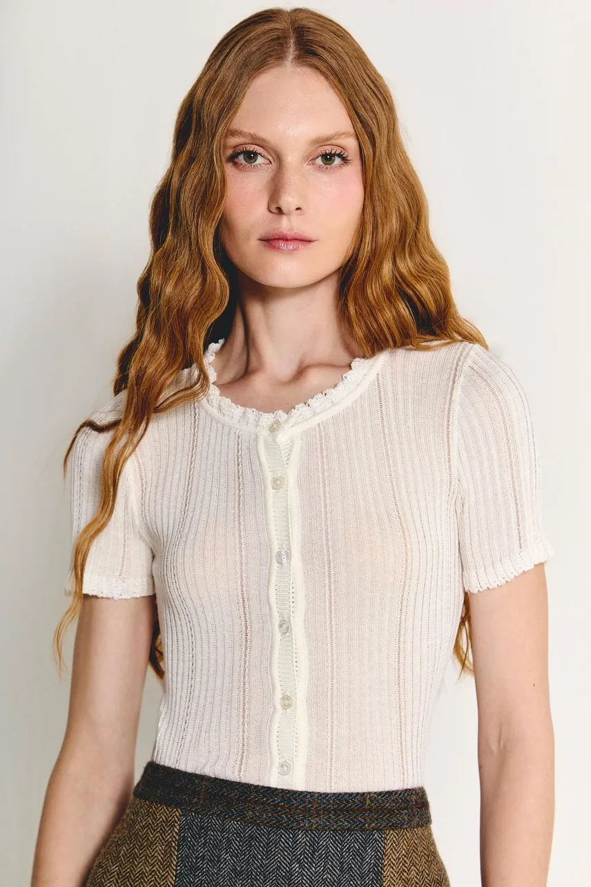 Blusa manga curta em tricot leve com modelagem regular, fechamento frontal por botões e decote com acabamento de frufru.