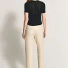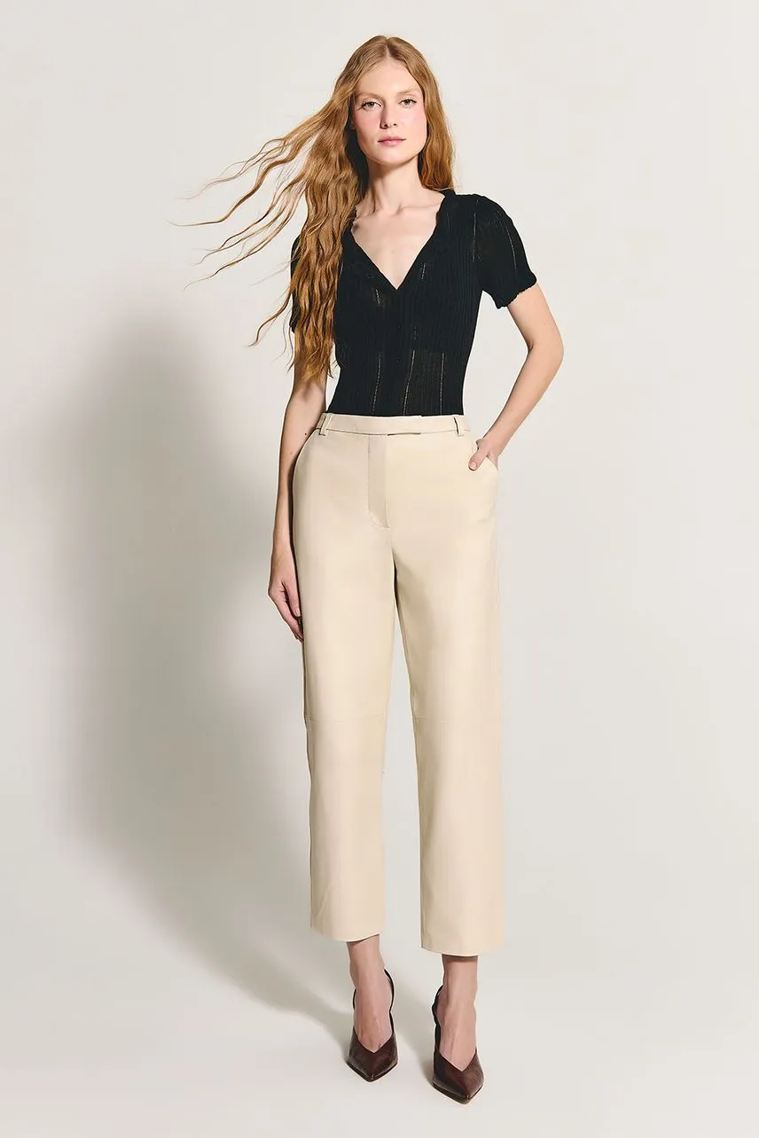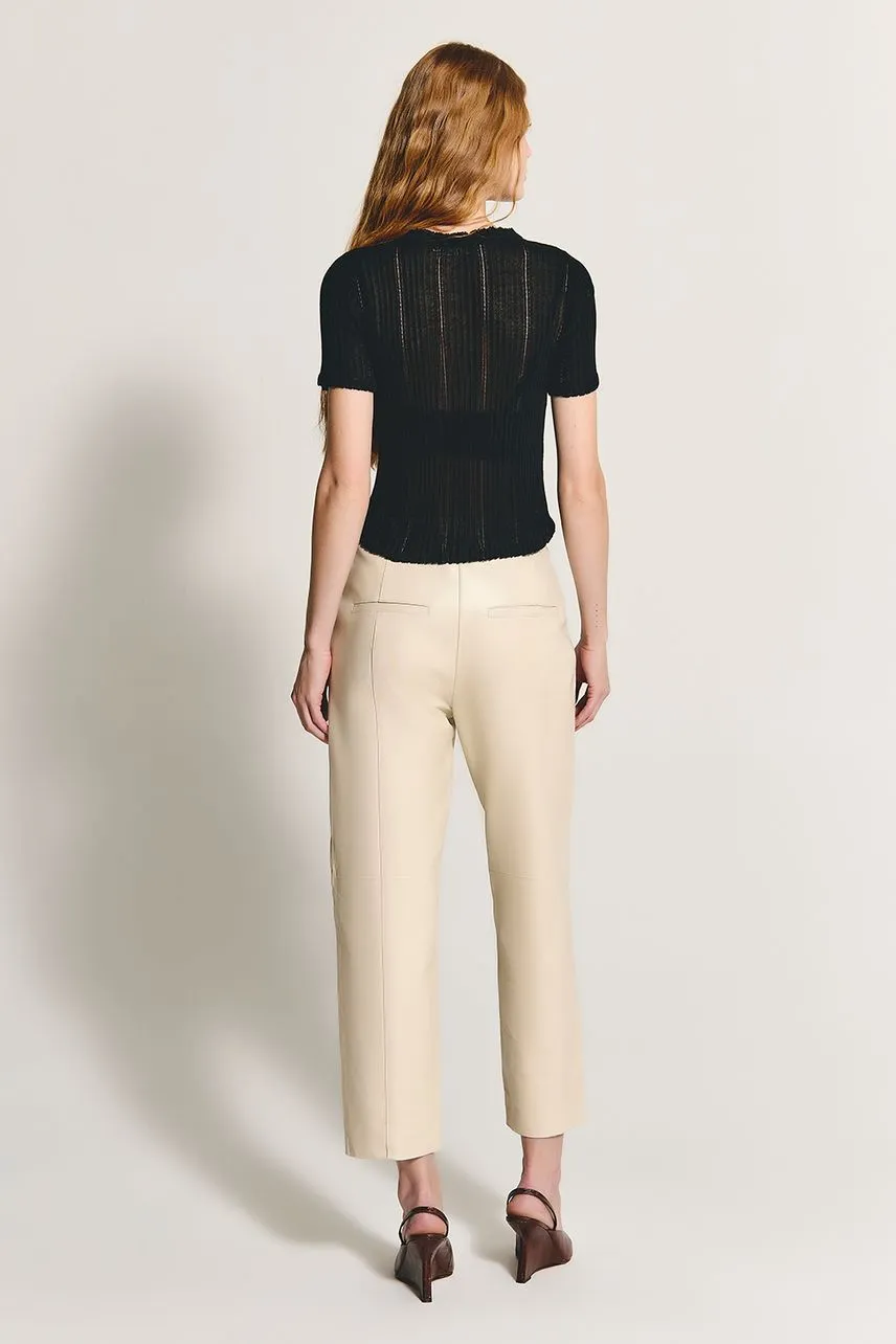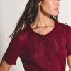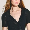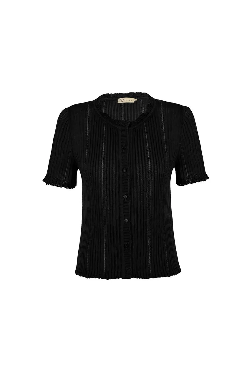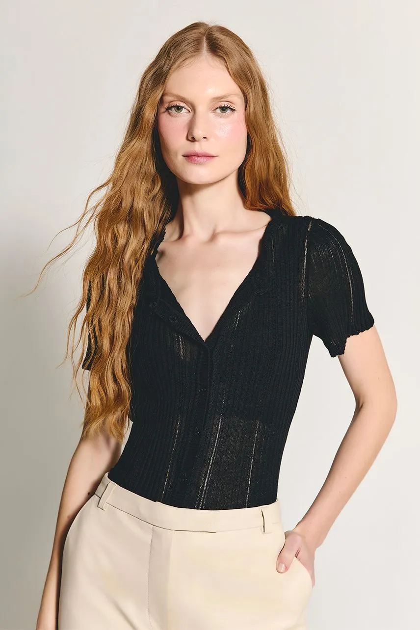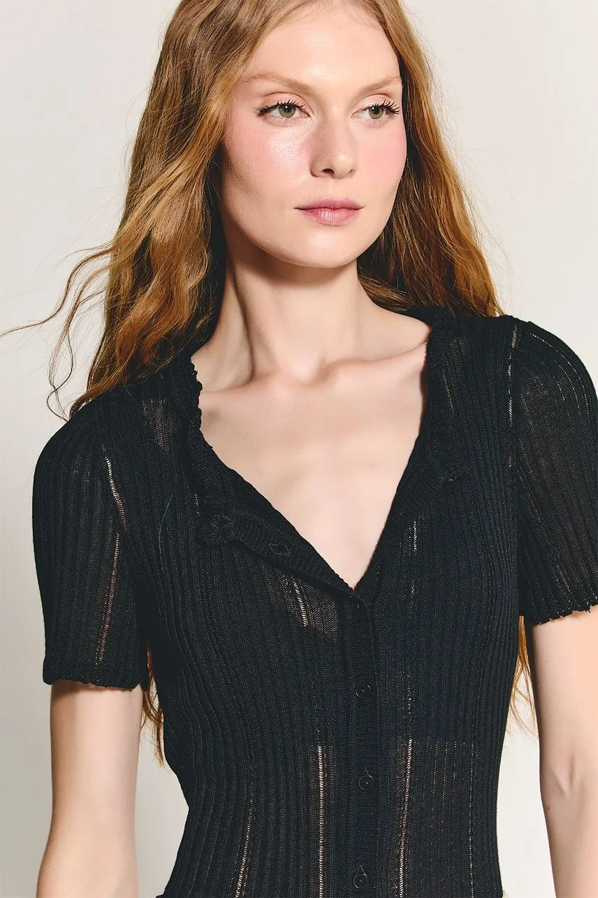 Blusa manga curta em tricot leve com modelagem regular, fechamento frontal por botões e decote com acabamento de frufru.