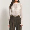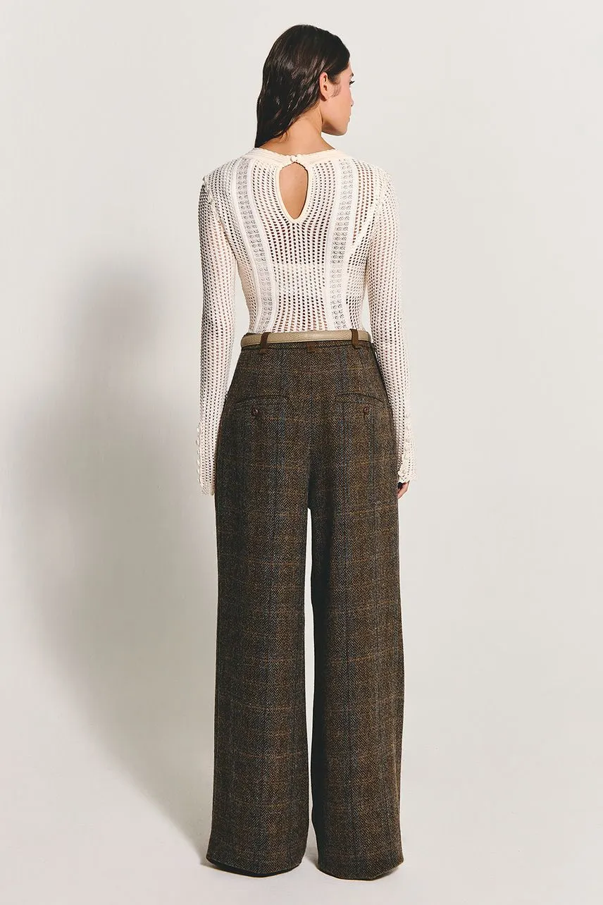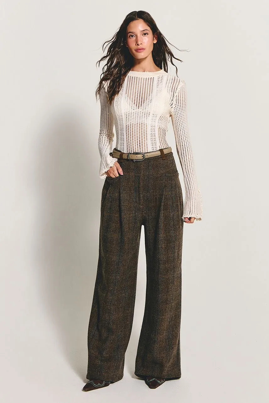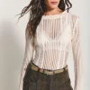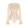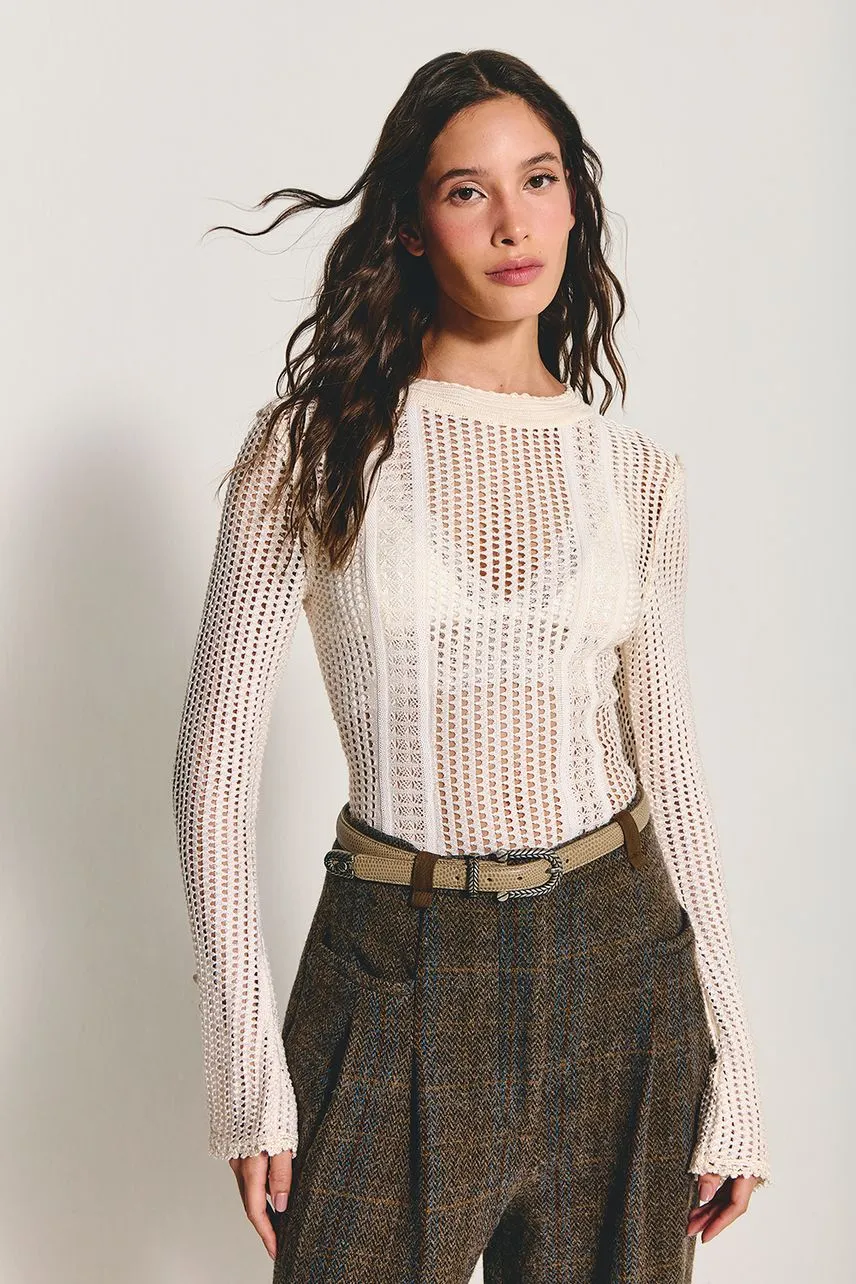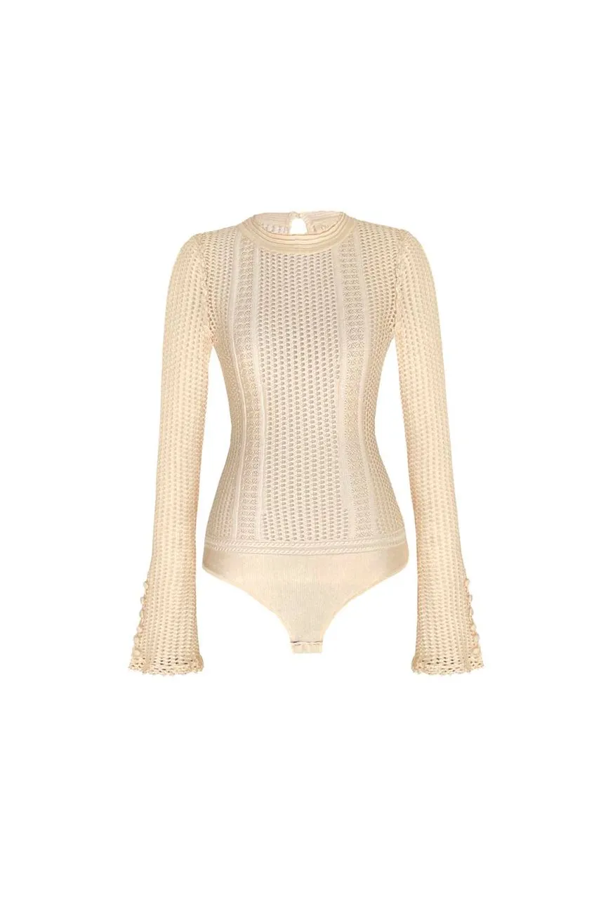 Body em tricot de pontos crochetados, possui mangas longas com barra sino e modelagem slim.