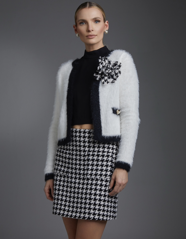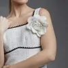 O broche Flor Gabi é confeccionado em tweed P&B. O acessório possui tamanho grande, proporcionando um visual romântico e moderno.