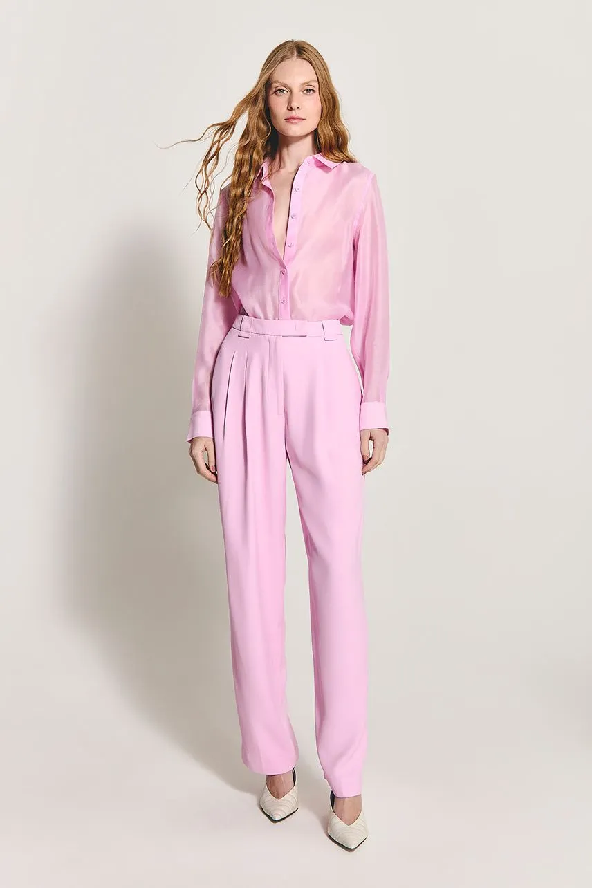 Calça em crepe de acetato com modelagem reta. Possui pregas frontais, passante para cinto e fechamento por botão interno.