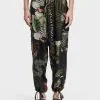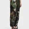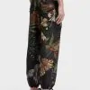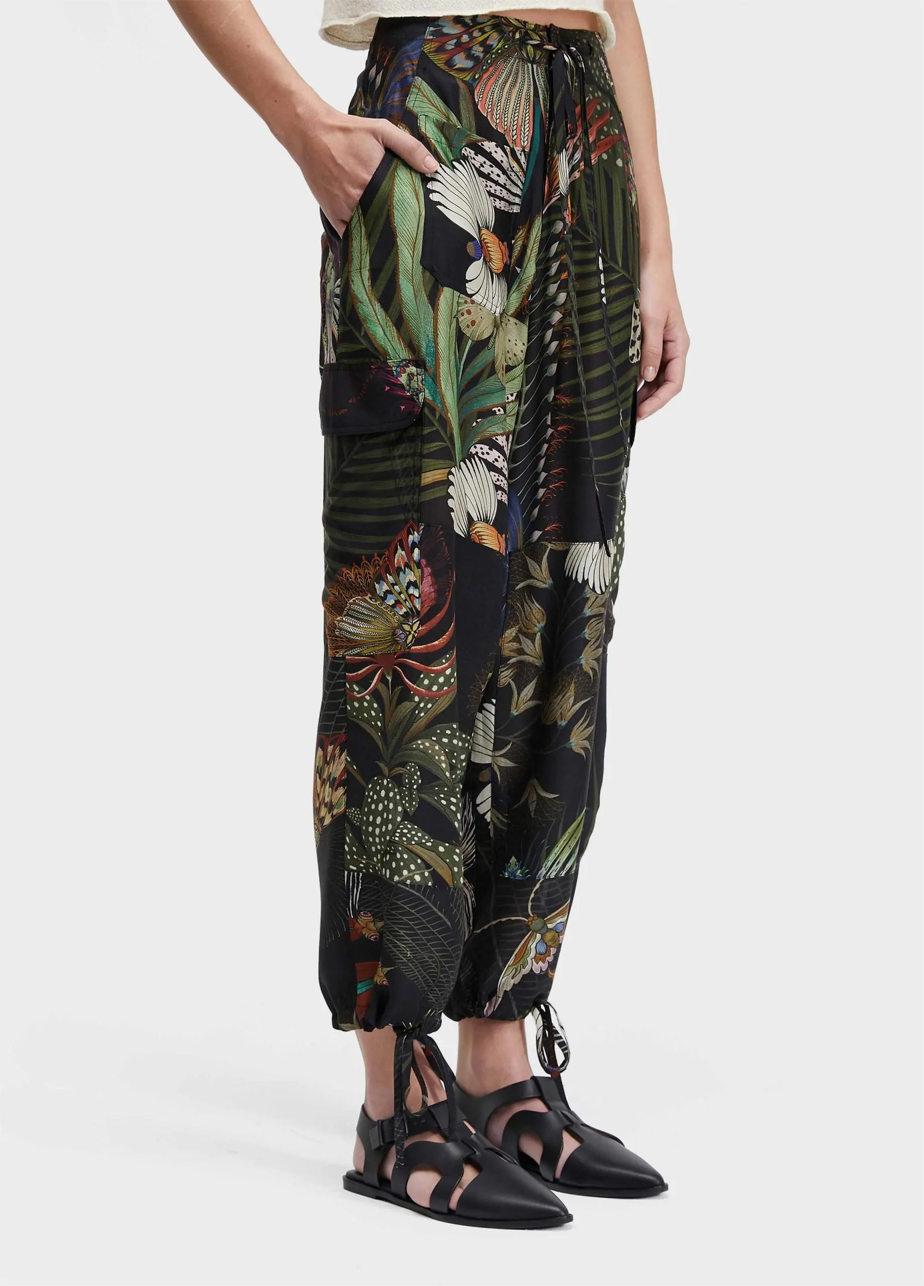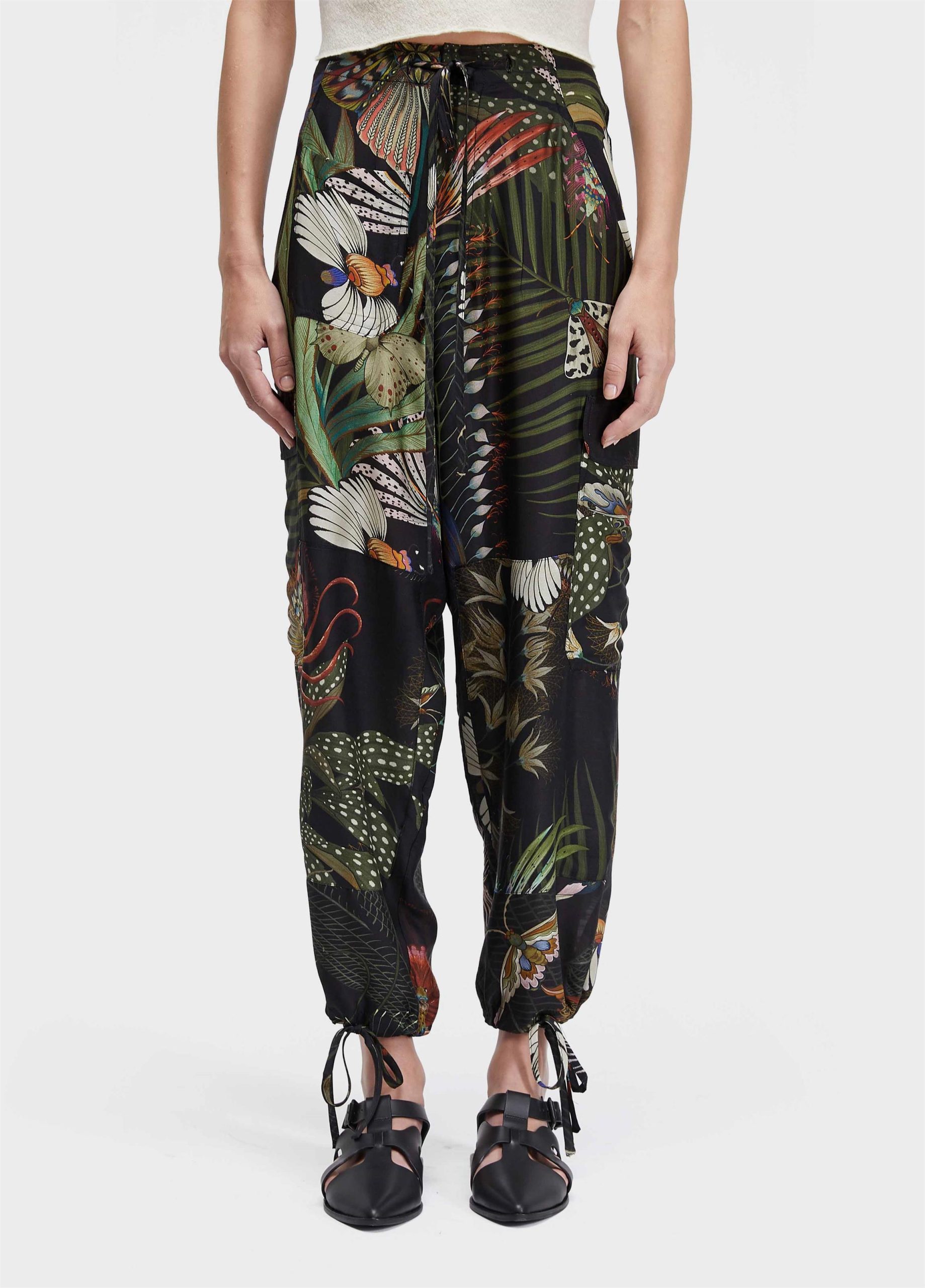 calça feminina; viscose com seda; modelagem over com bolsos frente e costas, recortes, amarração nas barras e no cós, com abertura frontal com zíper e colchete; caimento fluido; estampa BOTANIQUE