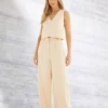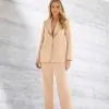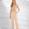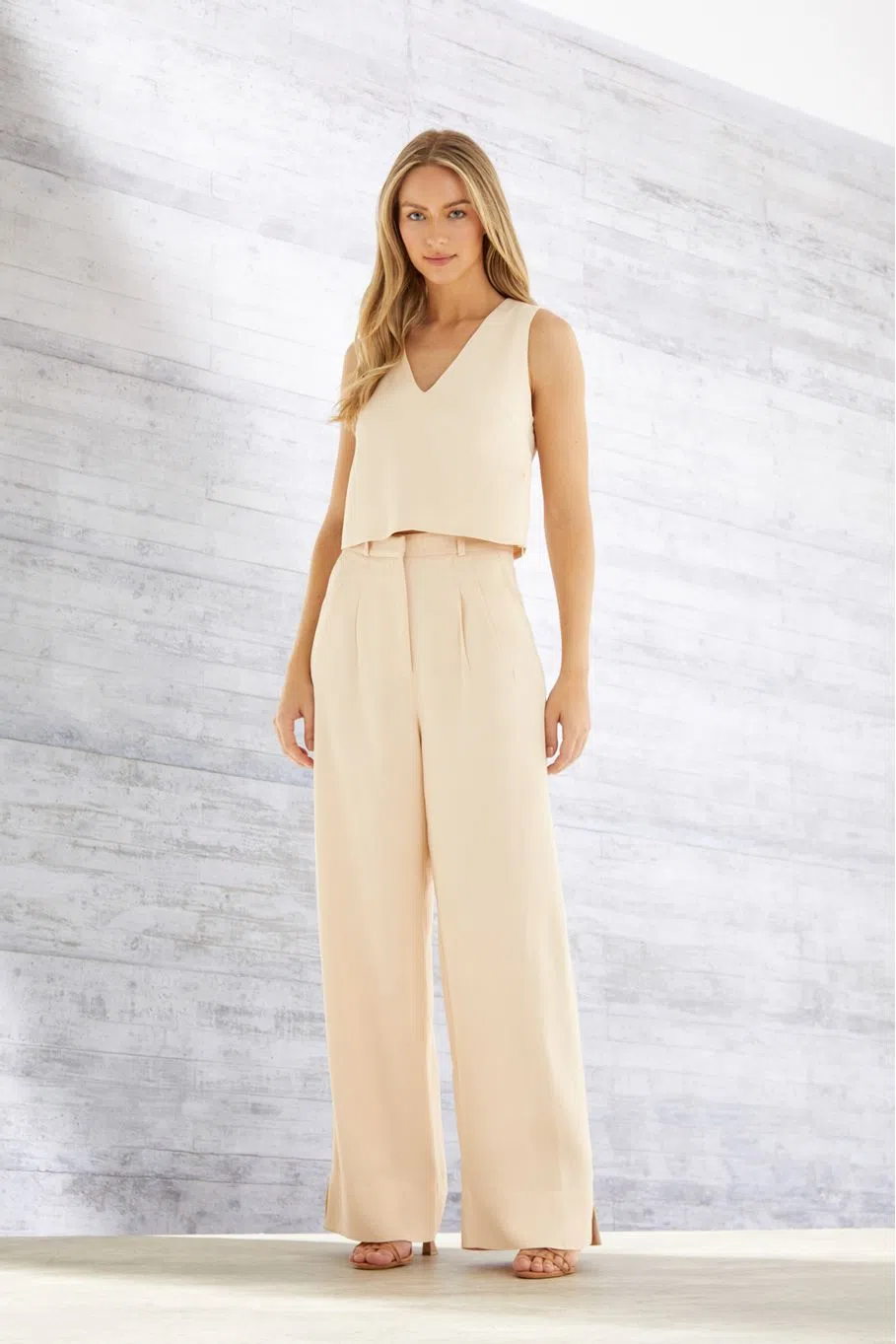 A calça creme é confeccionada em crepe de alfaiataria. A peça apresenta cós alto com detalhe anterior em pregas, que proporcionam movimento e elegância ao look. Possui modelagem wide leg, passantes para cinto, caimento leve, fecho dianteiro por zíper e colchetes e acabamento pespontado.