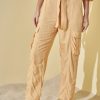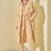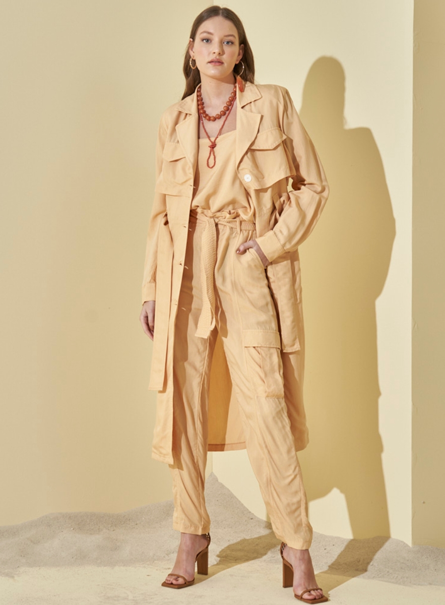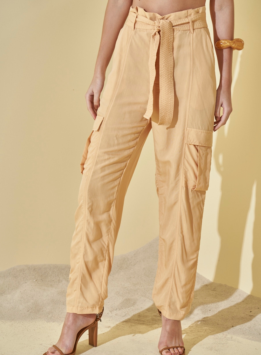 Calça cargo com corte em alfaiataria. A peça possui cós com passantes e faixa para amarração, fecho por meio de dois ganchos internos e zíper. Possui bolsos laterais superiores, bolsos cargo com lapelas e bolso traseiro falso.