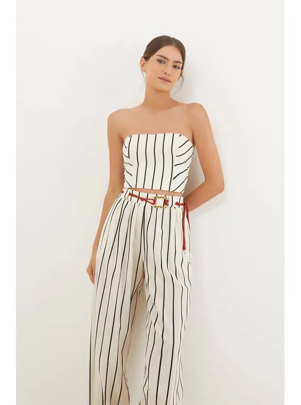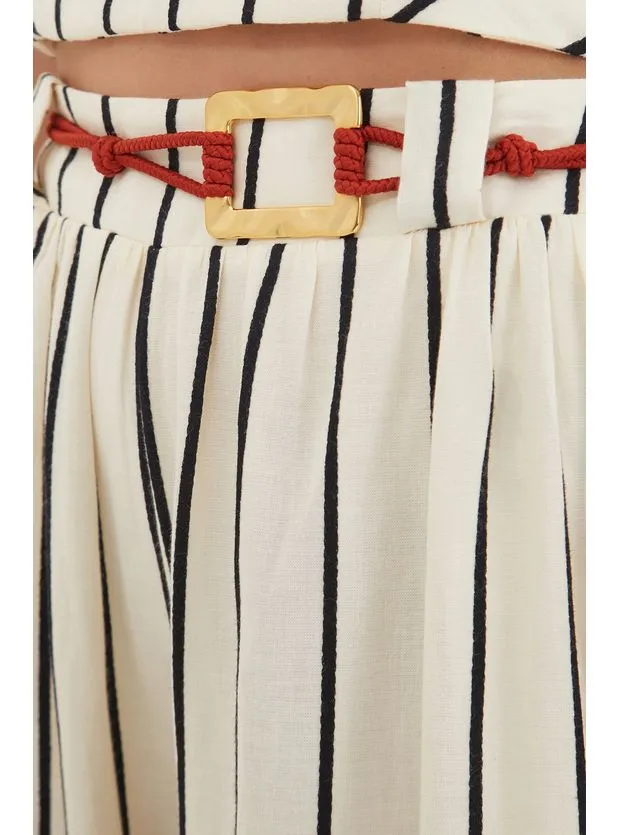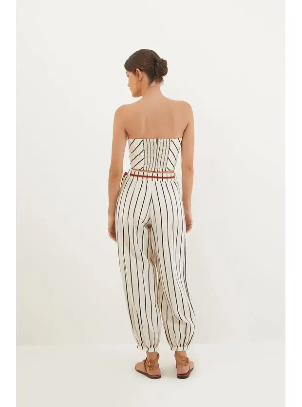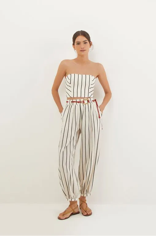 Esta peça tem o tecido de algodão certificado BCI/ABR, que garante uma forma de produção mais sustentável. – Cintura média – Cós largo com passantes para cinto – Elástico nas costas – Zíper na lateral – Pernas levemente afuniladas e barra fina – Acompanha cinto de corda em formato roliço e detalhe em metal dourado com finalização de nó – Bolsos laterais – Possui forro Detalhes feitos à mão no ateliê ViX