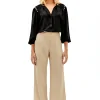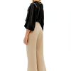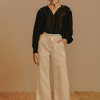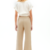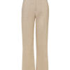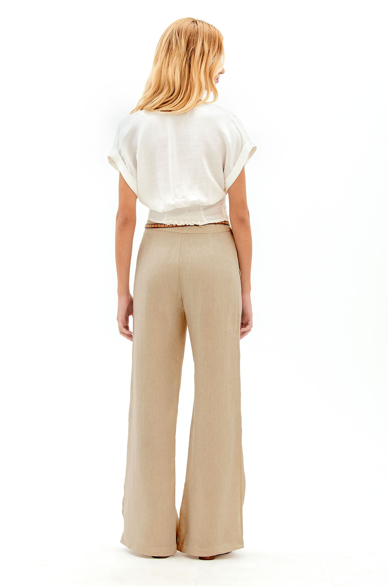 Calça alfaiataria em cambraia de linho, reta, mas com barra levemente aberta.