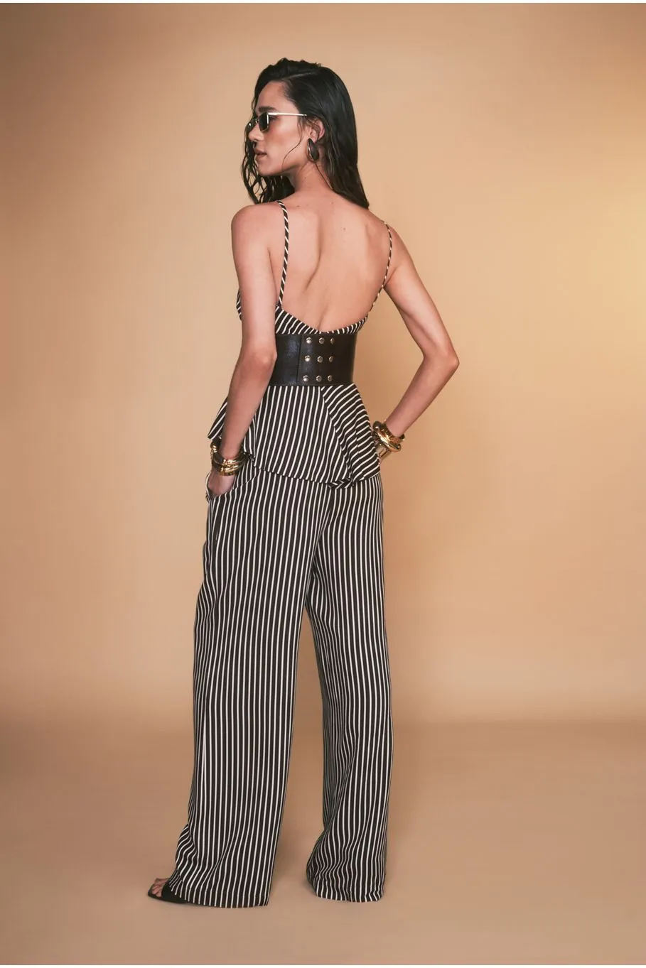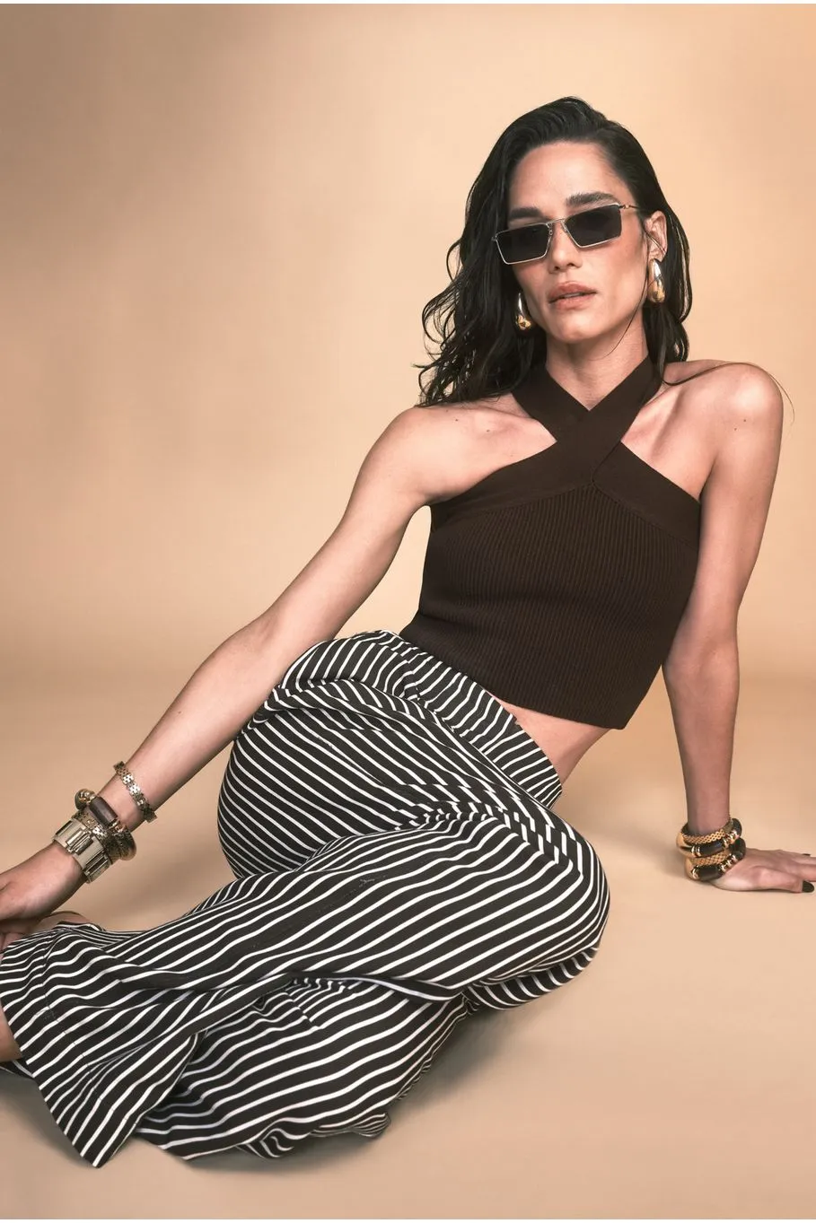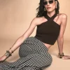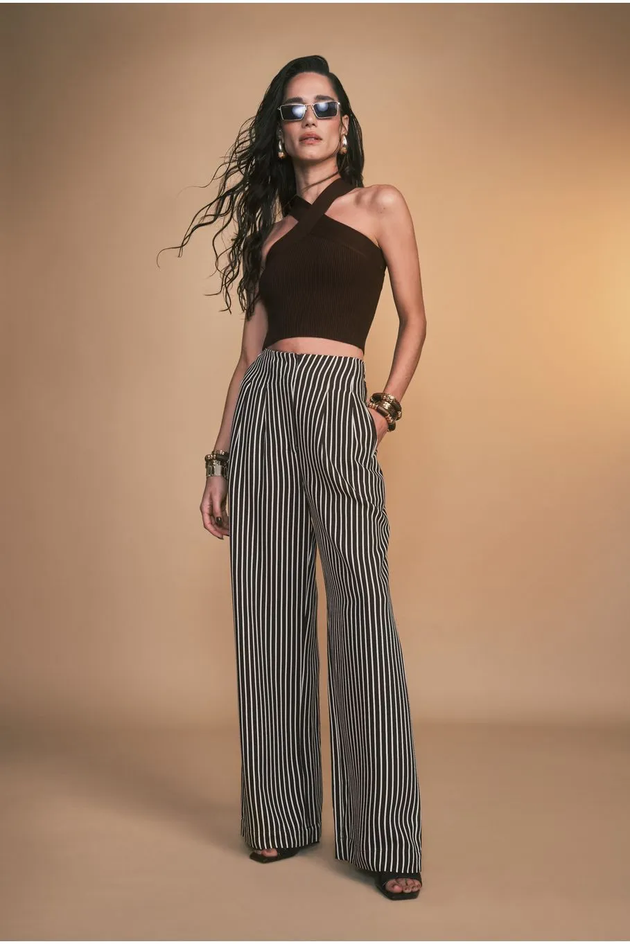 A calça Iris é confeccionada em viscose. A peça listrada em marrom e areia apresenta modelagem pantalona, proporcionando um visual moderno e elegante.