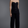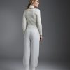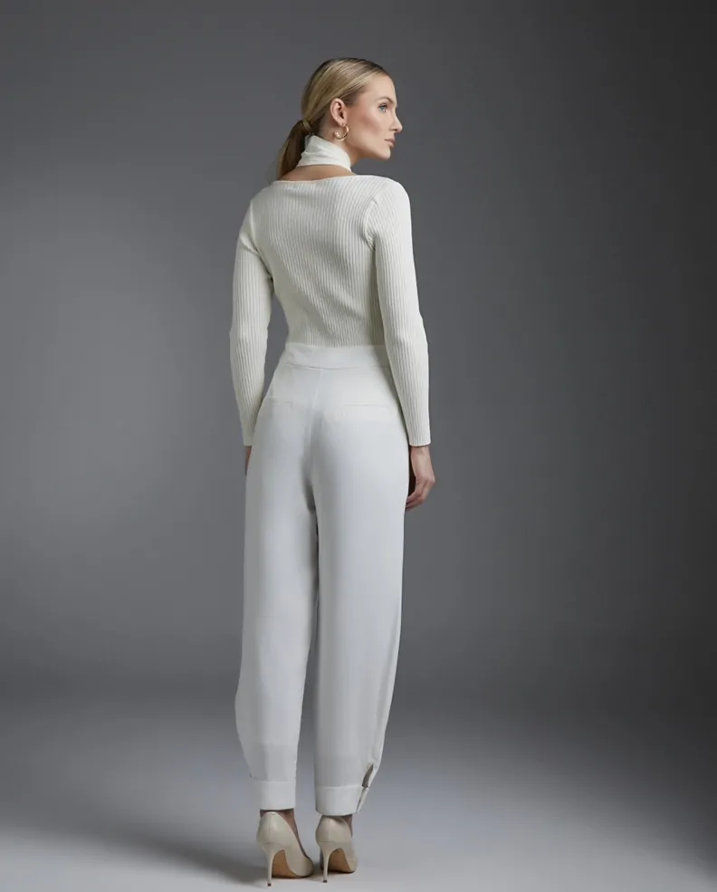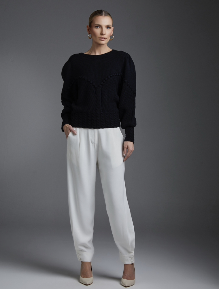 A calça Isabel é confeccionada em crepe alfaiataria. A peça apresenta modelagem cenoura com detalhe de pregas e botões encapados no tornozelo, proporcionando um visual elegante e despojado ao mesmo tempo. Possui cós alto seguido por pregas anteriores, bolso faca, bolso fake posterior, caimento reto e acabamento pespontado. Fecho anterior por zíper de nylon, colchetes e botão interno.