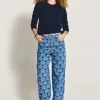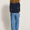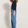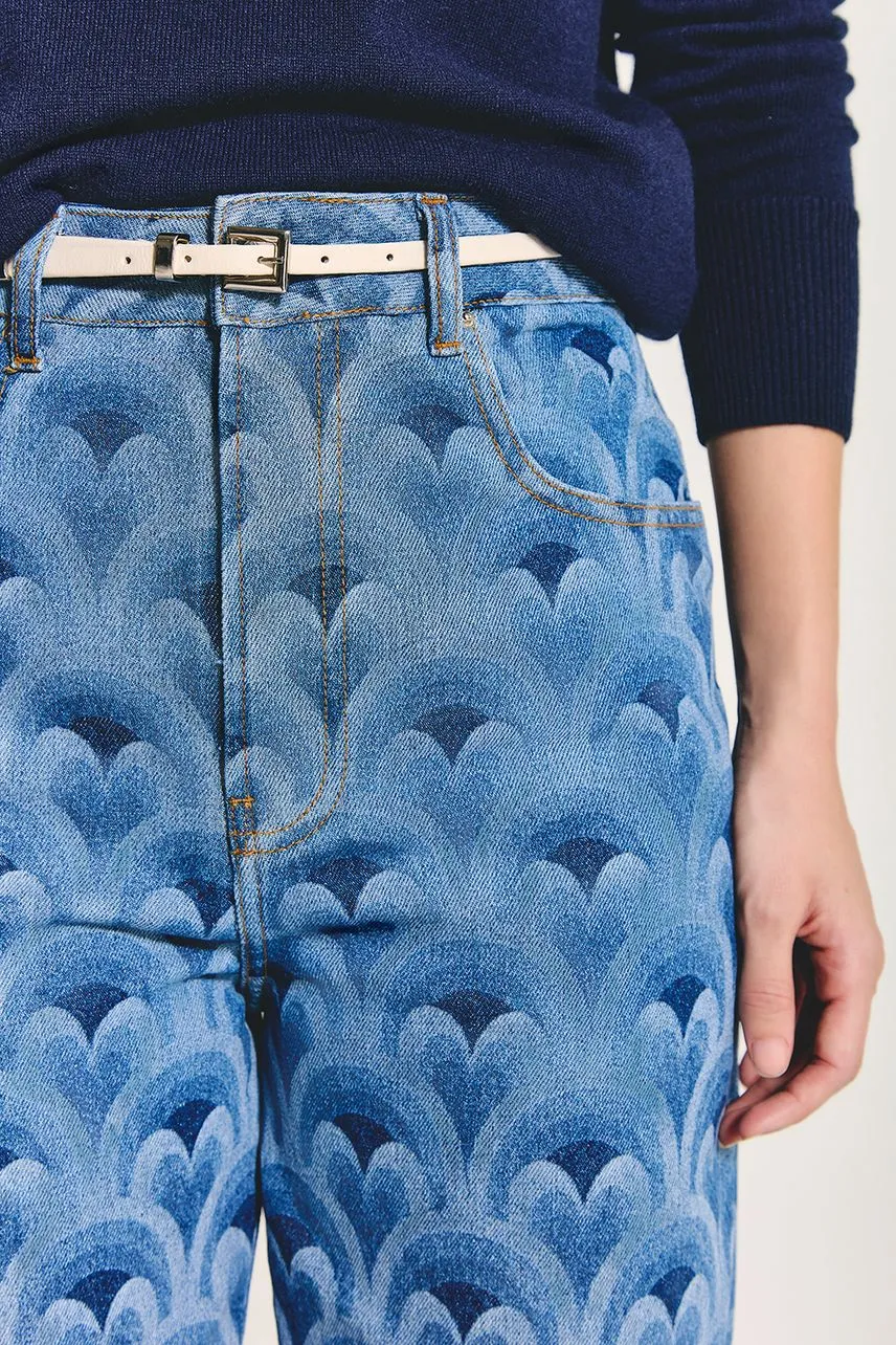 Calça jeans cintura média em estampa exclusiva da coleção. Fechamento frontal por botão e zíper de metal.
