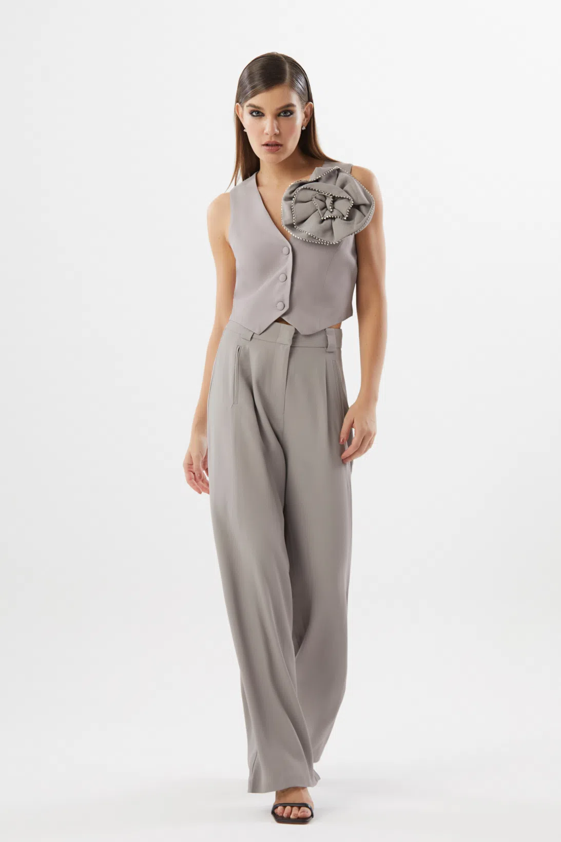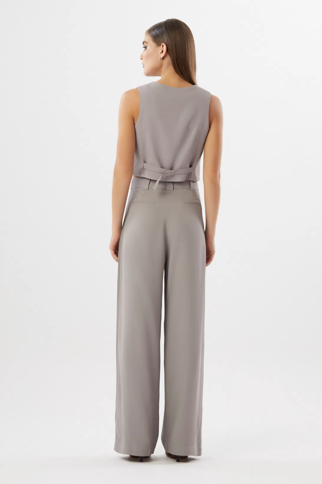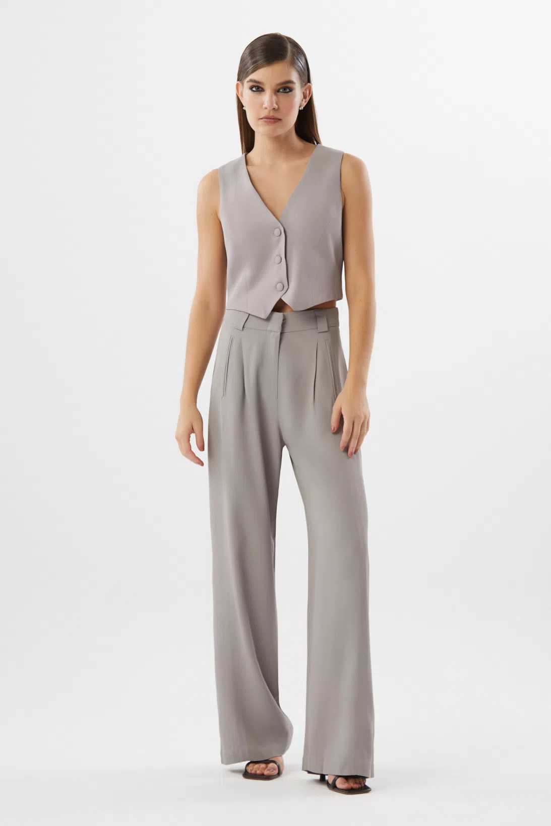 A calça Lanna é confeccionada em alfaiataria. A peça apresenta modelagem pantalona com cintura alta, bolso anterior vertical e pregas anterior, proporcionando um visual moderno e sofisticado. Possui cós com passantes para cintos, bolso fake posterior, acabamento pespontado, fechamento por zíper de nylon, colchetes de metal e botão interno.