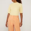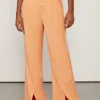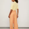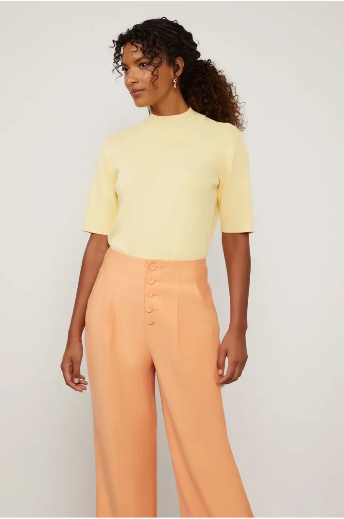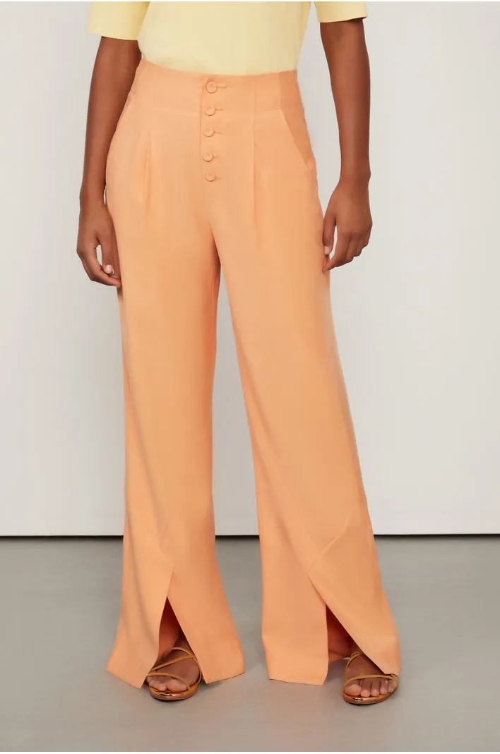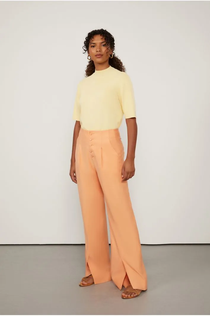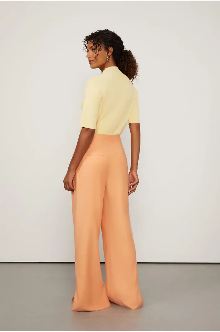 A Calça Ampla com modelagem pantalona surge no Laranja Aura, um dos tons solares da estação. O modelo possui fechamento por botões encapados e frontais, cintura alta, bolsos nas laterais, bolso faca nas costas, pregas e fendas frontais na barra. Entre as combinações da coleção, o Amarelo Golden da blusa cria uma proposta de color block suave e cheia de personalidade.