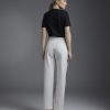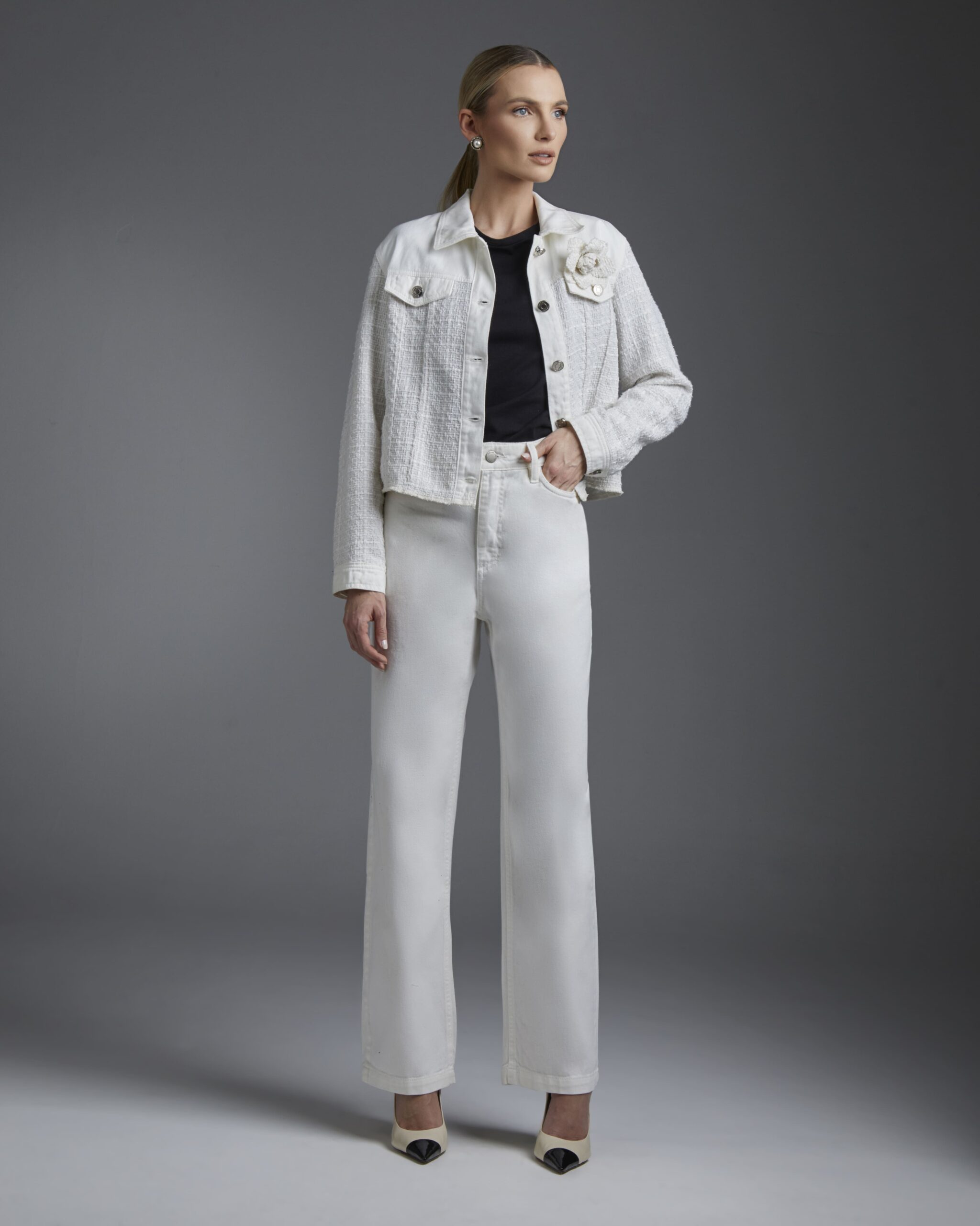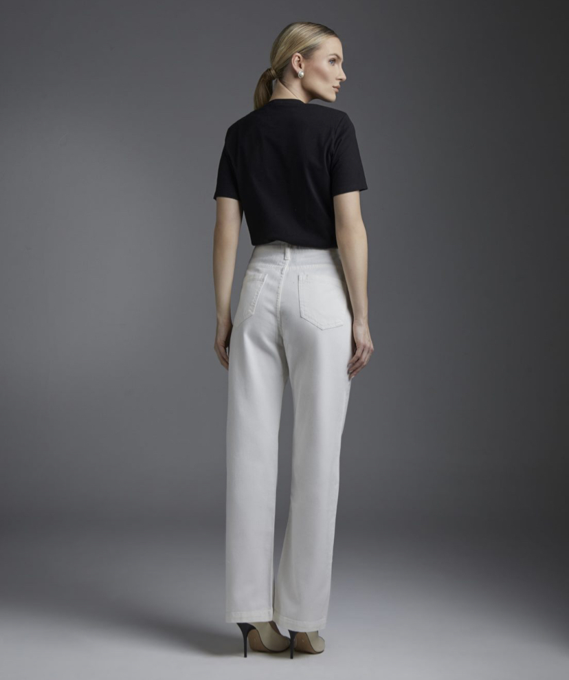 A calça Luna é confeccionada em sarja. A peça apresenta modelagem reta, cintura alta com detalhes do tecido tweed nos bolsos, proporcionando um visual moderno e sofisticado.