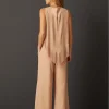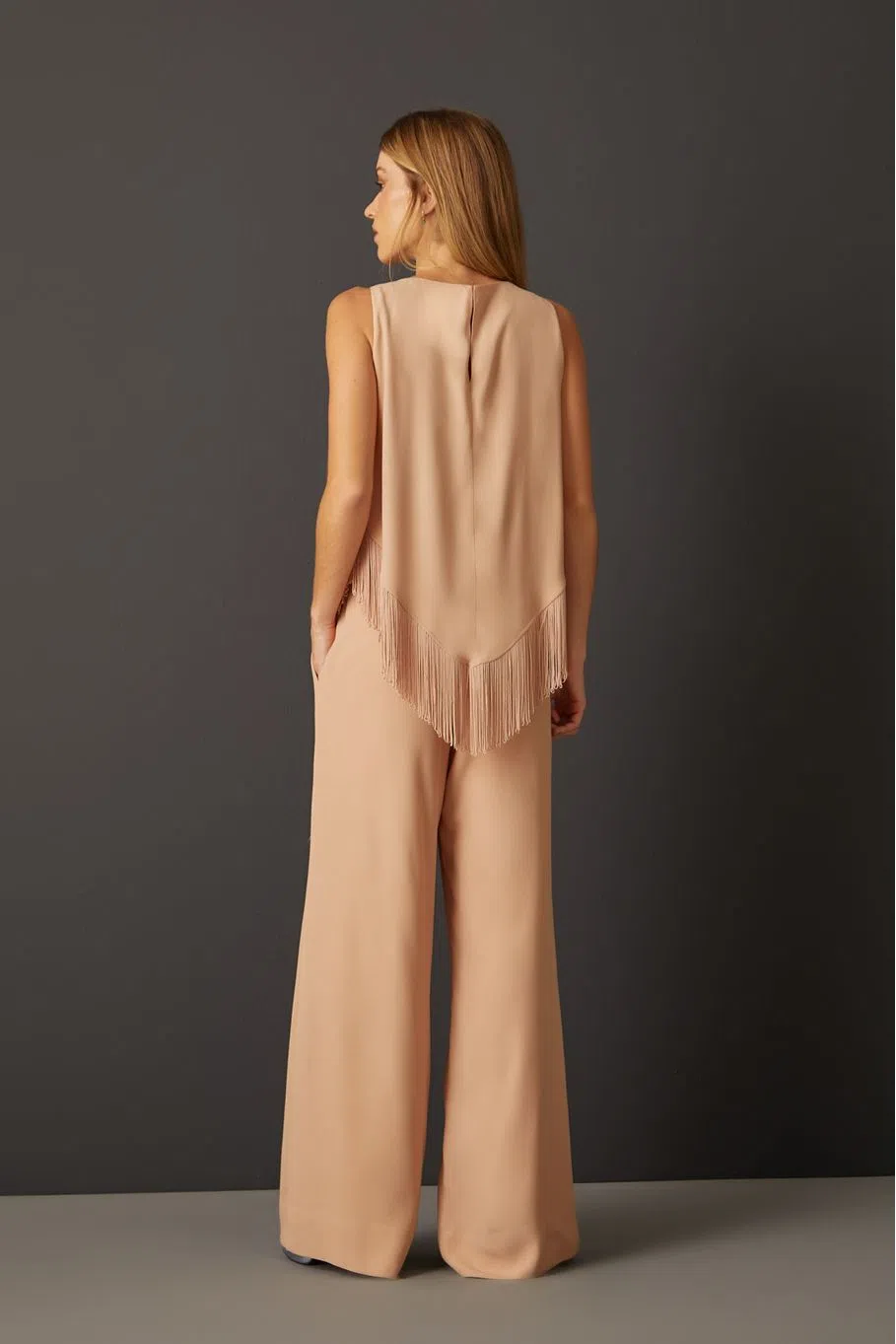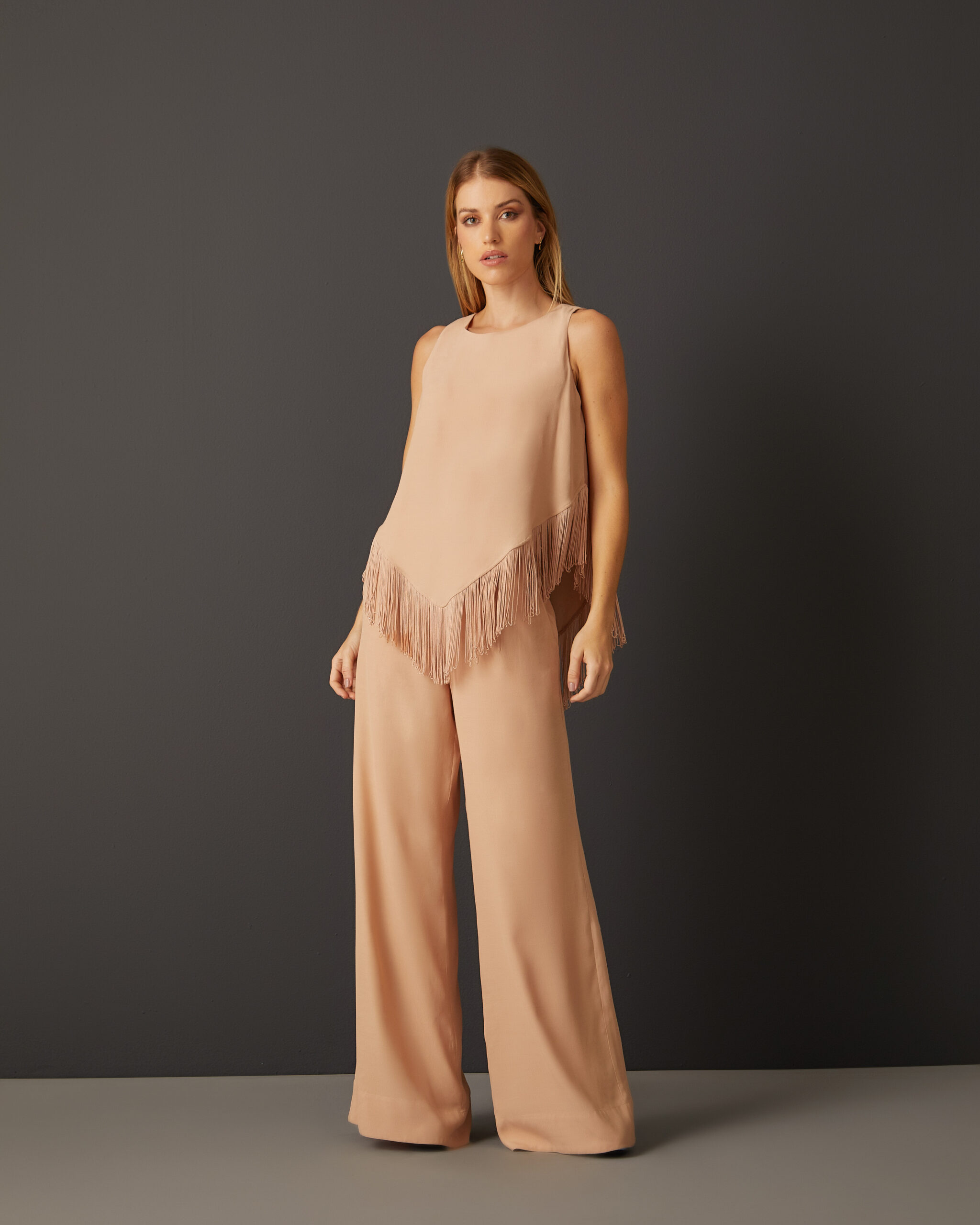 A calça é confeccionada em alfaiataria de viscose. A peça apresenta modelagem pantalona, proporcionando um visual elegante e contemporâneo. Possui caimento amplo e acabamento pespontado.