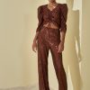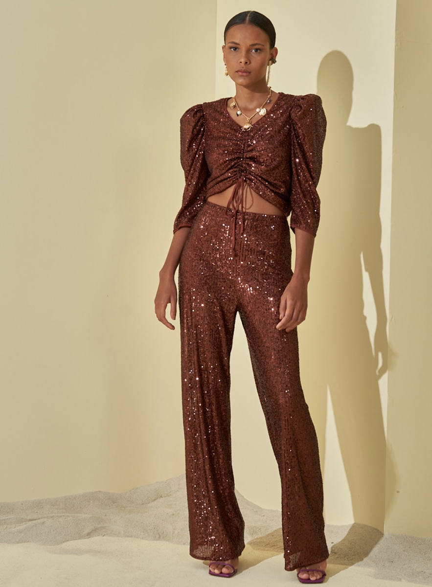 A peça possui cintura alta, fecho por meio de zíper semi-invisível na lateral esquerda, modelagem reta e shape slim.