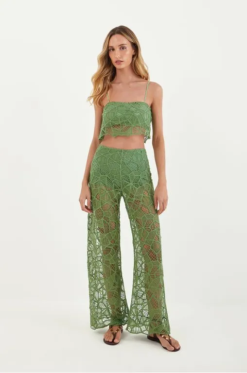 calça pantalona verde Hollie pode ser combinada com tops, batas e blusas da coleção. A laise exclusiva ViX em patchwork com diferentes desenhos e texturas. A delicadeza do tecido especial em pequenos cut-outs que esculpem cada peça, criando padrões equilibradamente assimétricos.