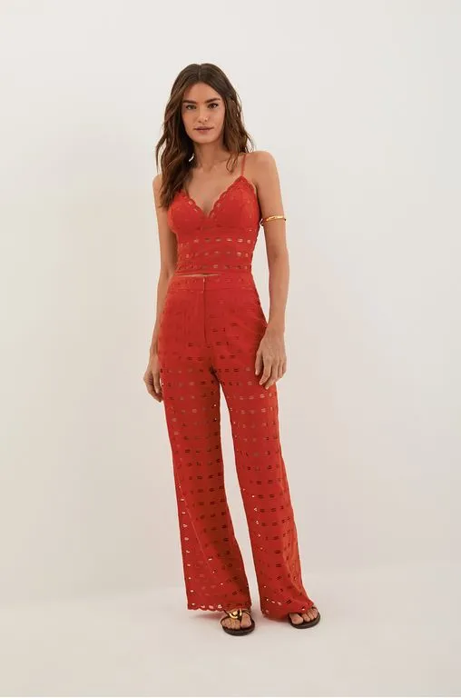 calça de laise vermelha Raya é uma peça cool para combinar com tops e blusas da coleção. Leve seu look do dia para noite com flats, sandálias altas, bolsas e outros acessórios ViX. Uma exclusividade do ateliê ViX, a laise Olho tem recortes arredondados em padrões simétricos. – Cintura média – Braguilha e bolsos – Com forro curto Detalhes feitos à mão no ateliê