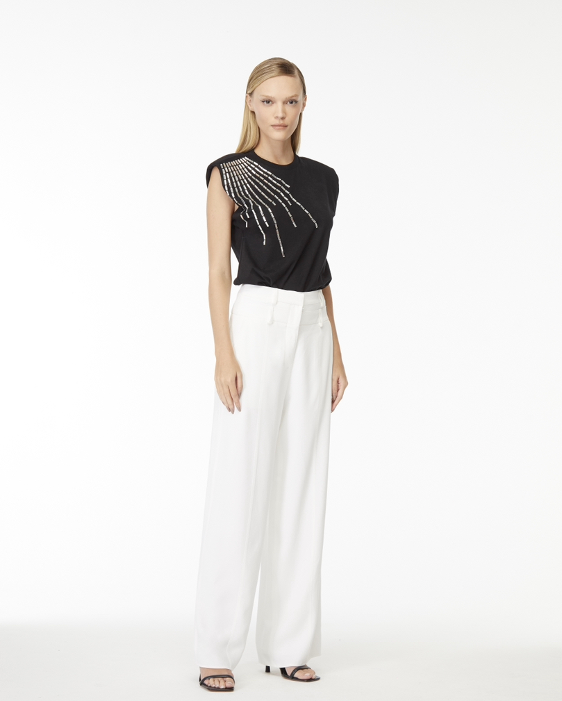 A calça Remy é confeccionada em alfaiataria. A peça apresenta modelagem pantalona de cós duplo com passantes para cinto e bolso faca, proporcionando um visual moderno e elegante. Possui detalhe de costura no meio anterior, forro solto, acabamento pespontado, zíper de nylon com botão interno e colchete anterior.