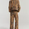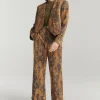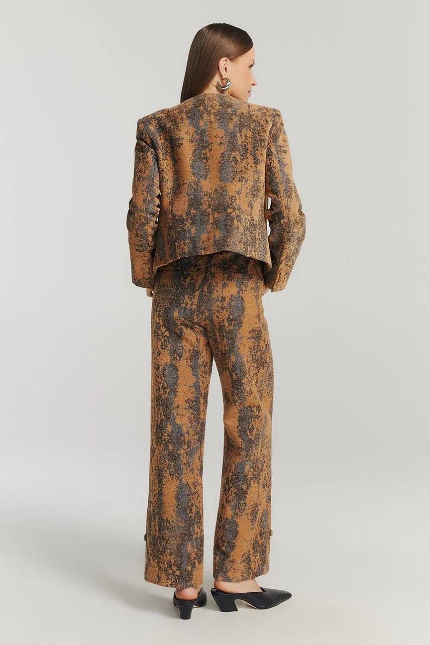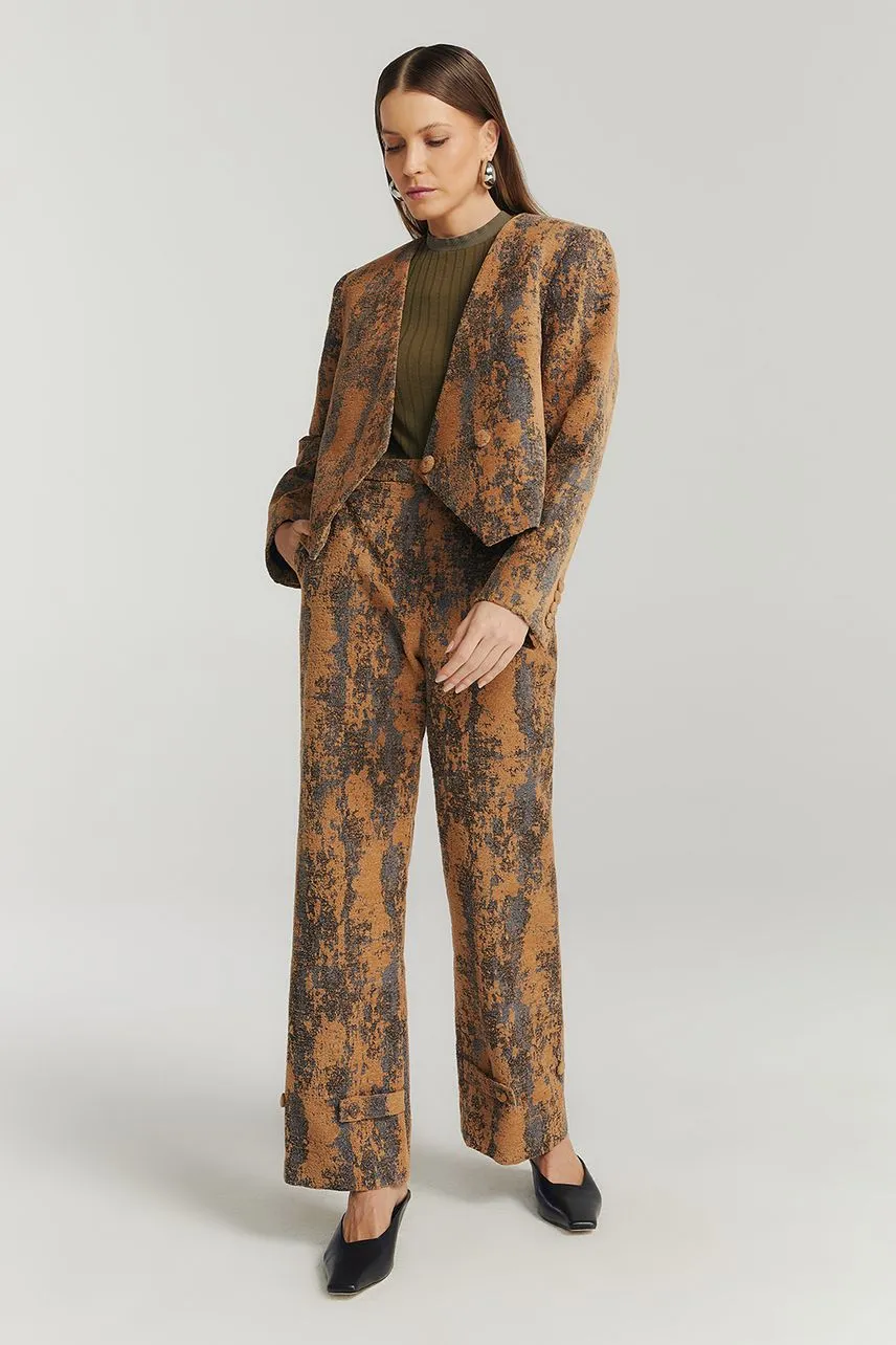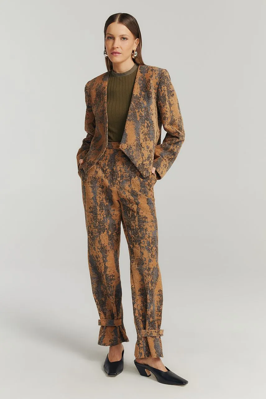 calça cintura média em jacquard com construção que remete a tapeçaria com padronagem marmorizada. Possui regulagem na barra por martingale e fechamento frontal por zíper e gancho de metal.