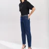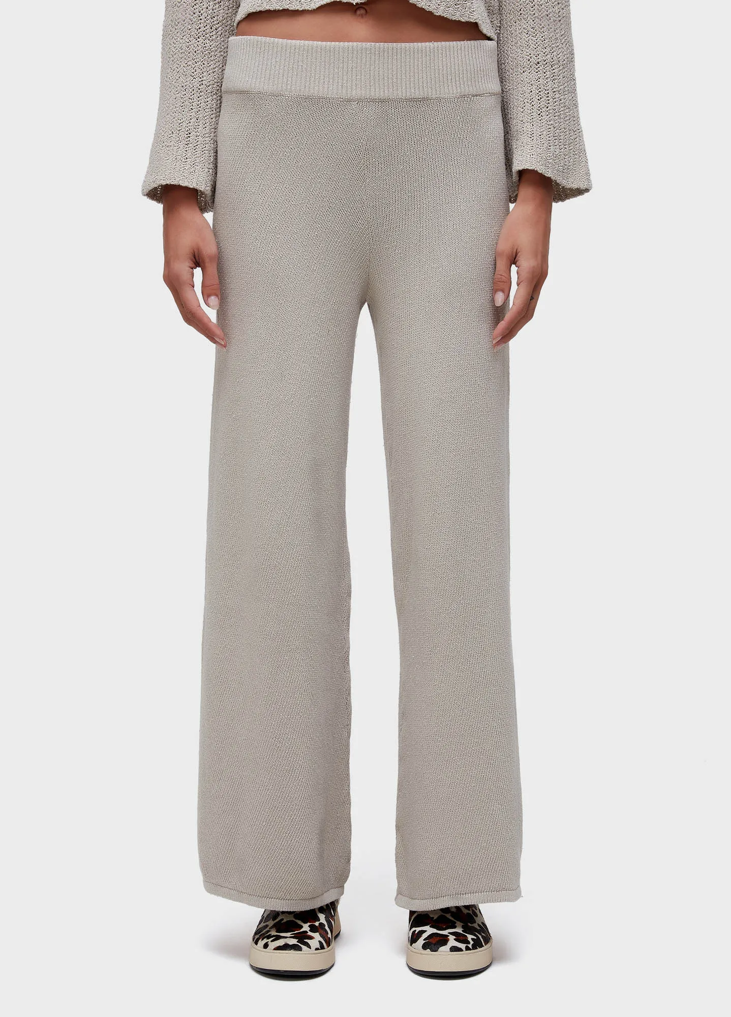 Calça de modelagem reta feita de tricot, desenvolvida com fio de algodão reciclado. Bandeira Re-design Waste. Ao usar algodão reciclado em suas coleções, a Osklen evita que cerca de 7,5 toneladas de resíduos têxteis sejam descartados por ano.