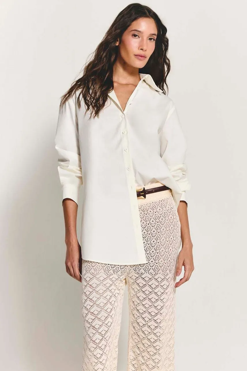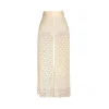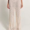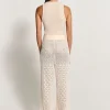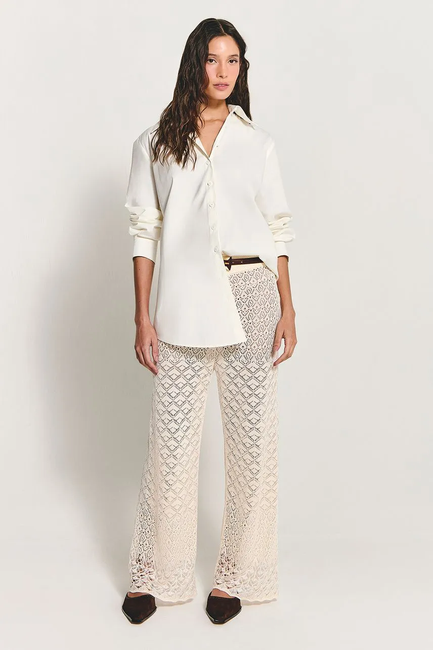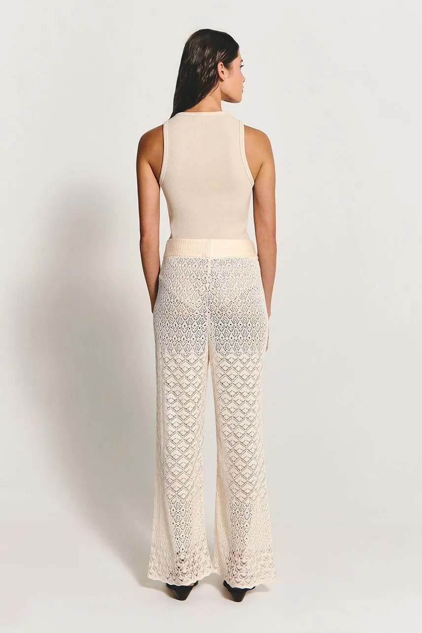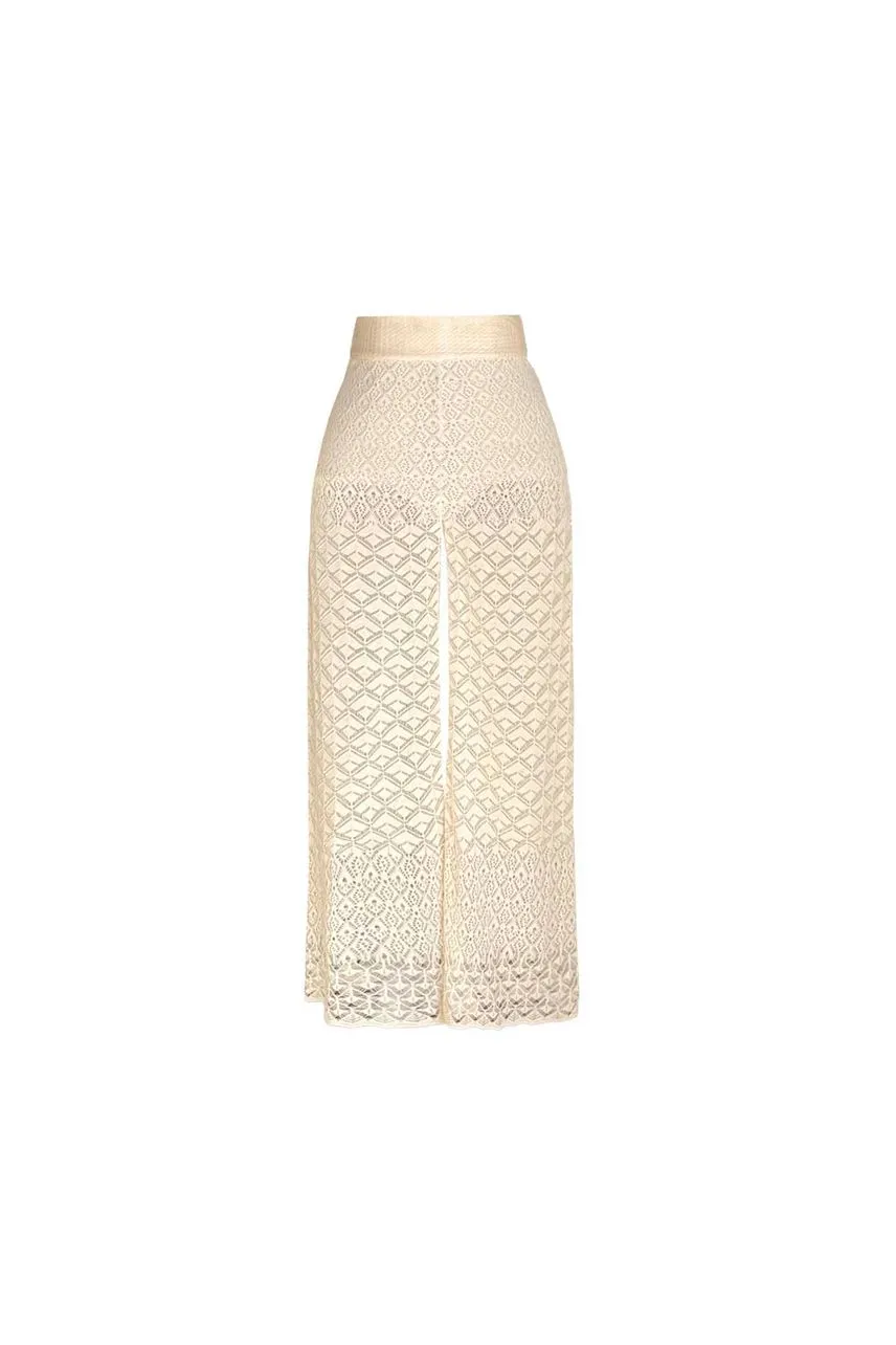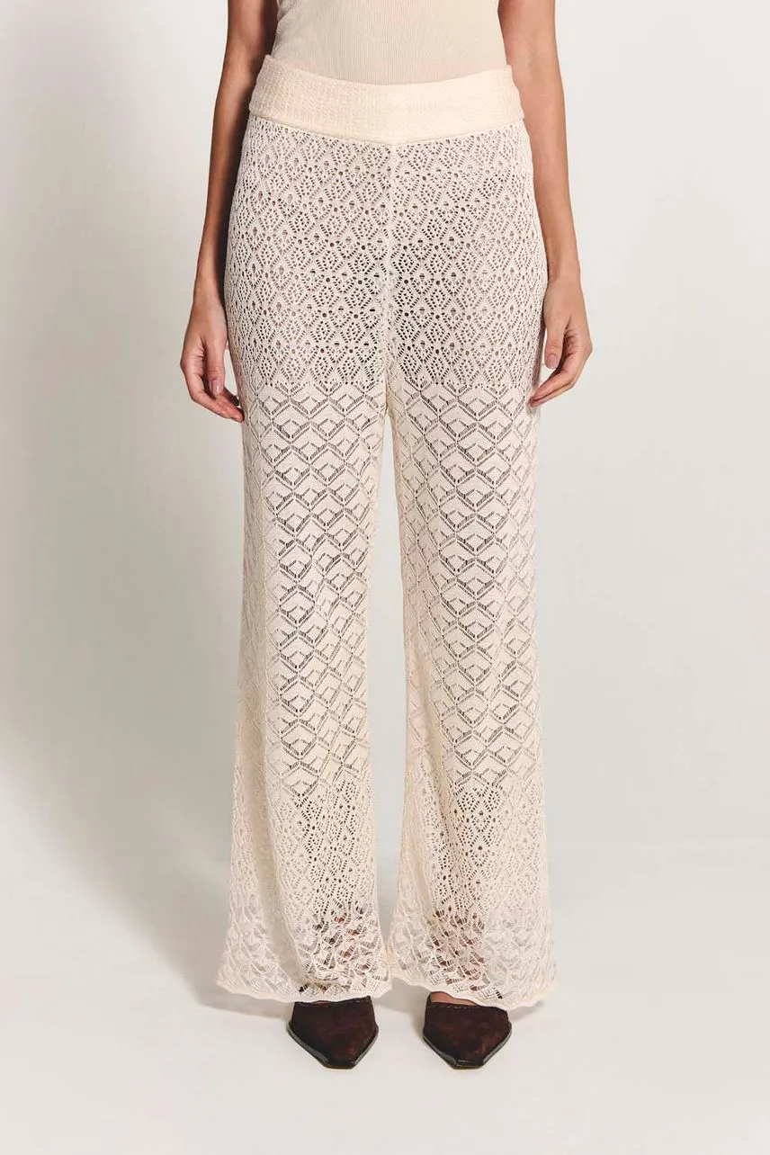 Calça em tricot de pontos estilo crochetados, possui modelagem regular e reta e cós de elástico embutido.