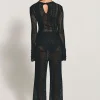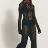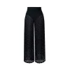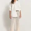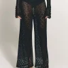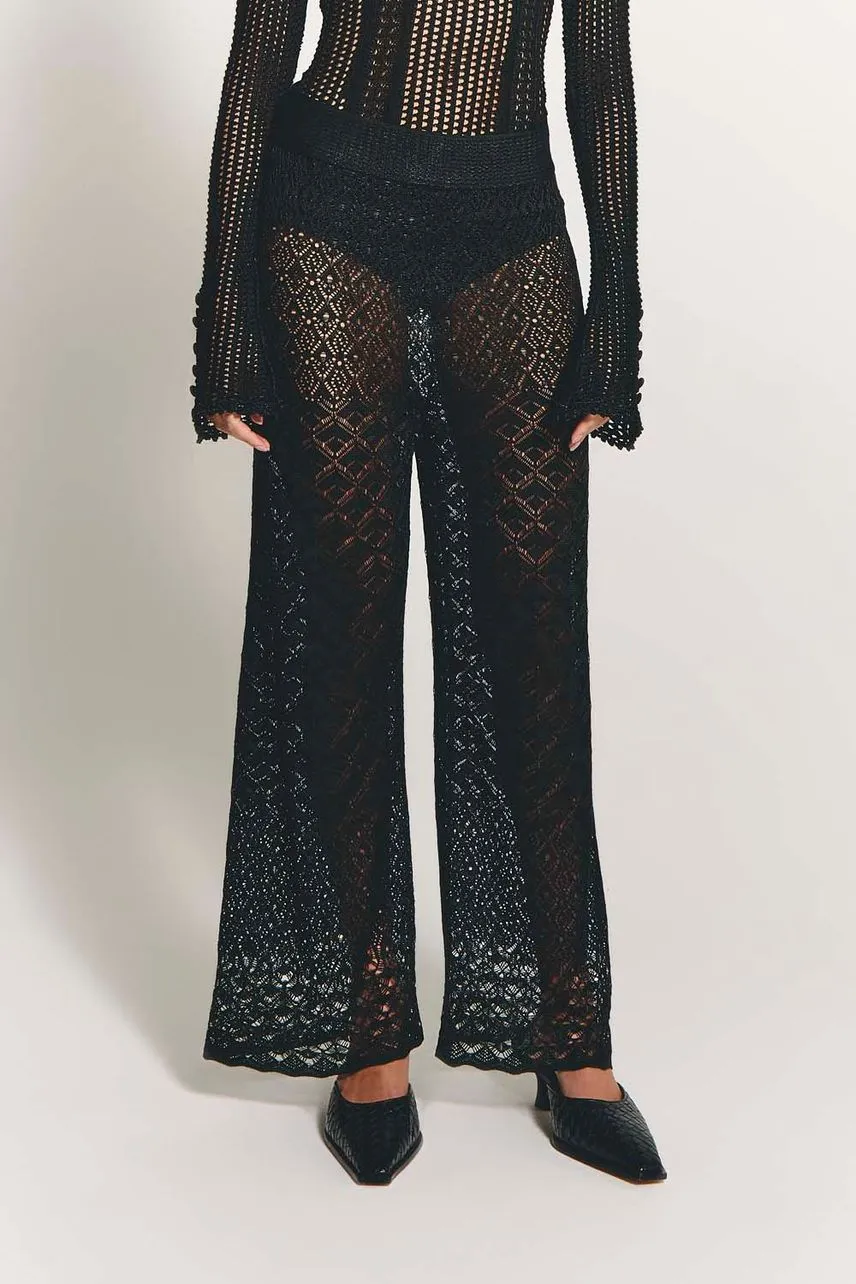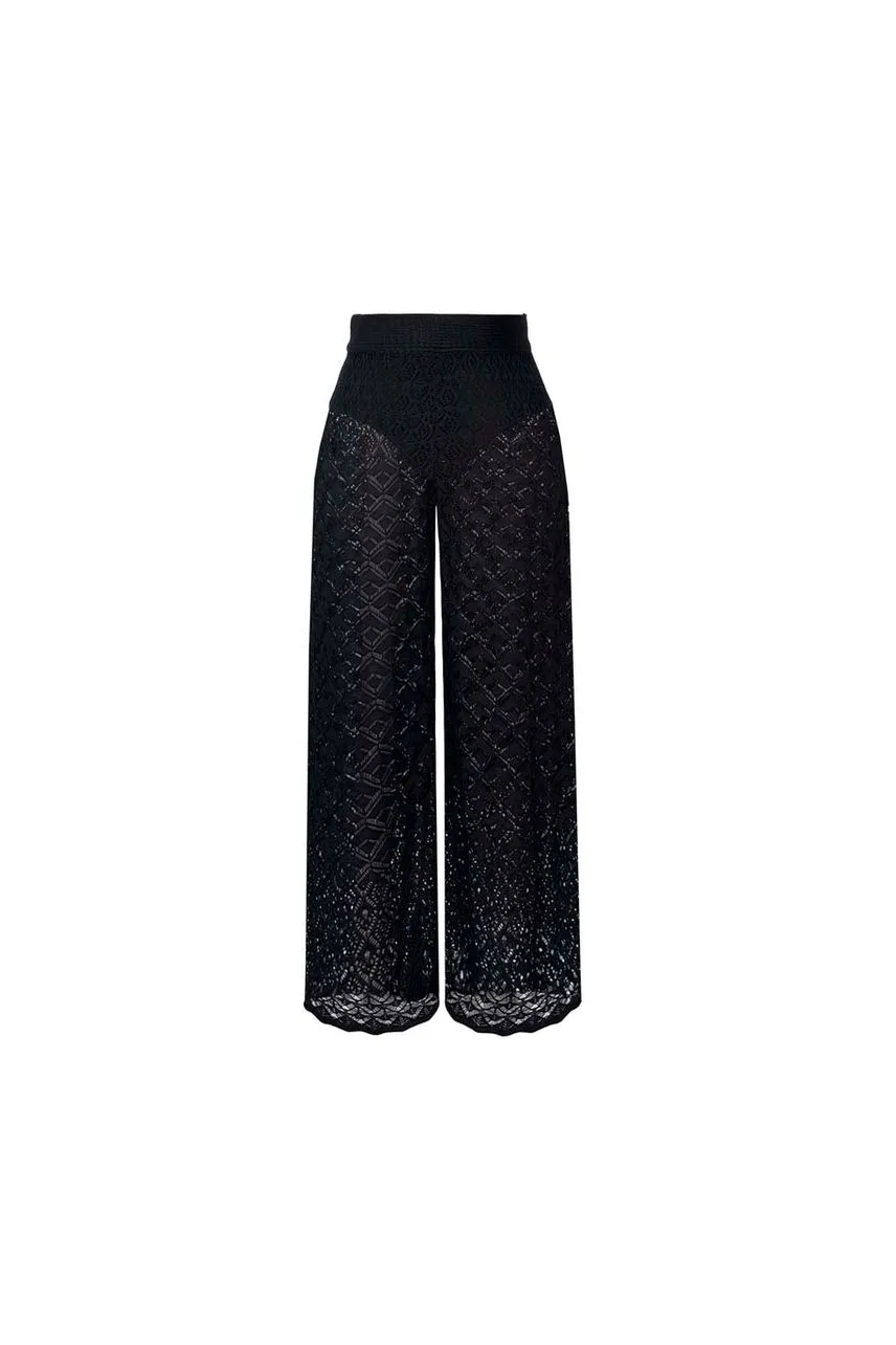 Calça em tricot de pontos estilo crochetados, possui modelagem regular e reta e cós de elástico embutido.