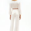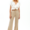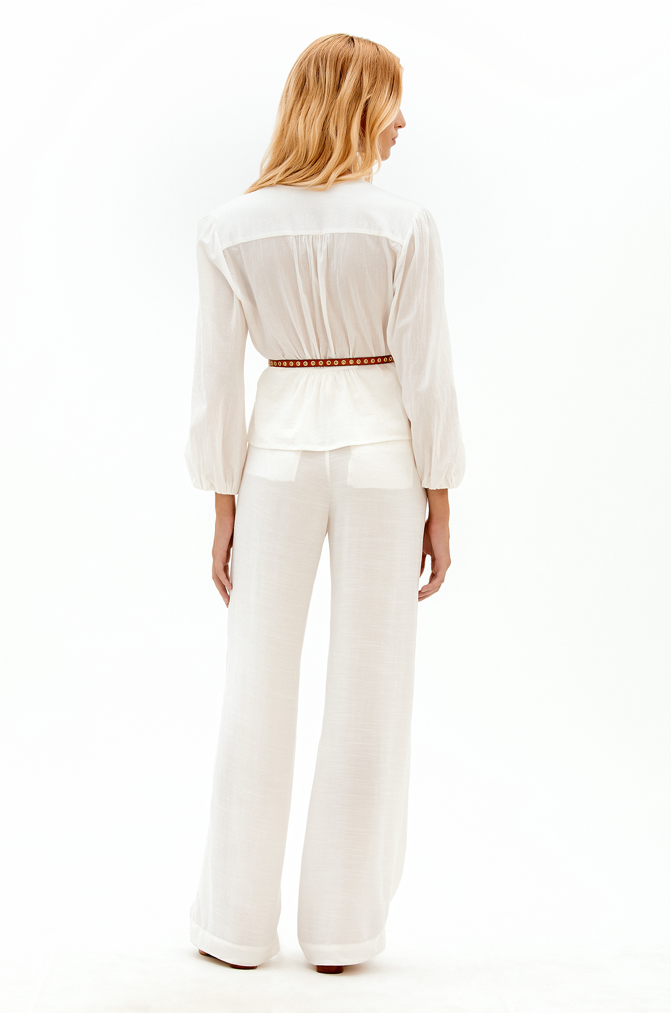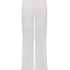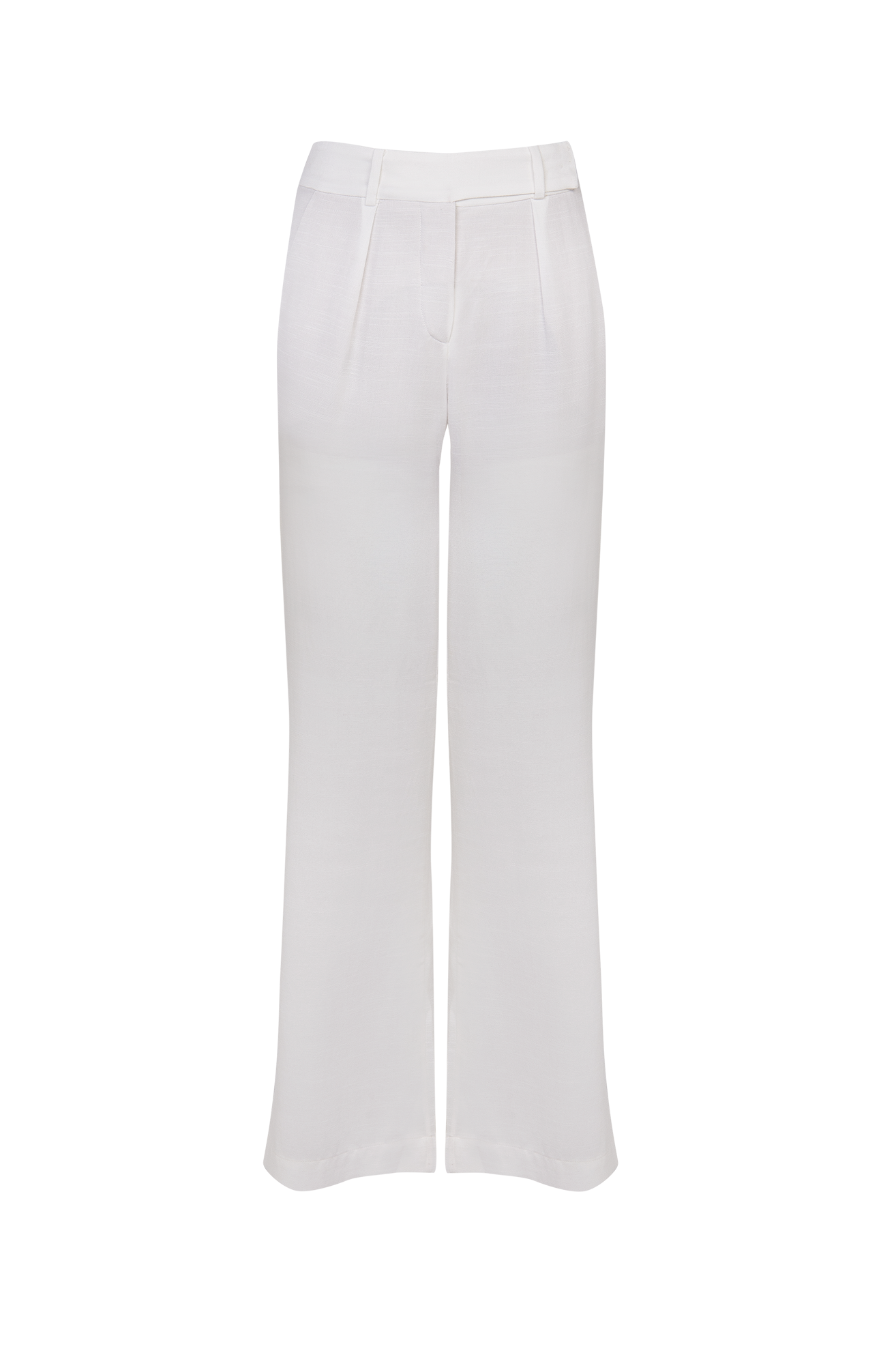 Calça comprida clássica de alfaiataria em linho rajado, com shape reto, pregas na frente, cós, braguilha, passador e bolso faca.