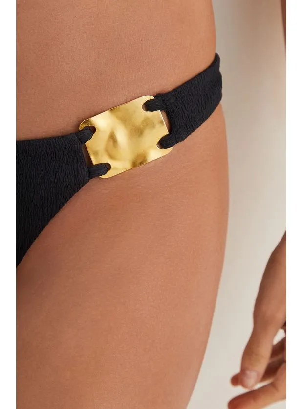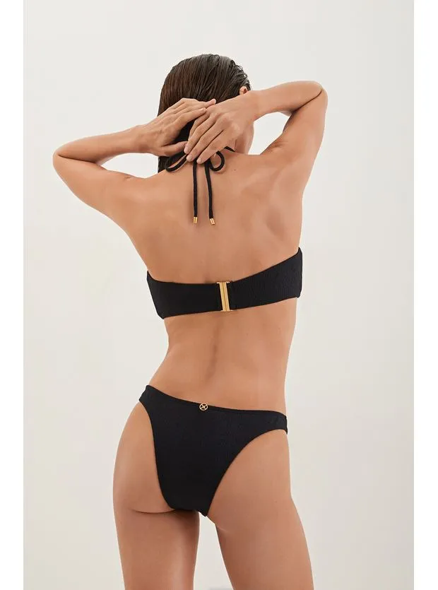 A calcinha de biquíni preta tem a modelagem Brasil. Pode ser usada mais alta ou mais baixa.