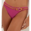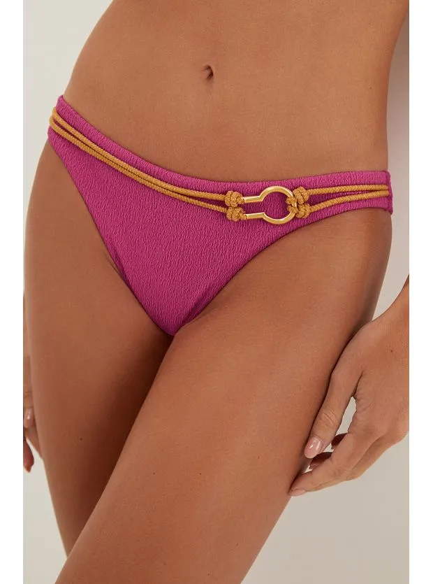 A calcinha de biquíni rosa tem a modelagem Brasil. Pode ser usada mais alta ou mais baixa.