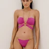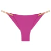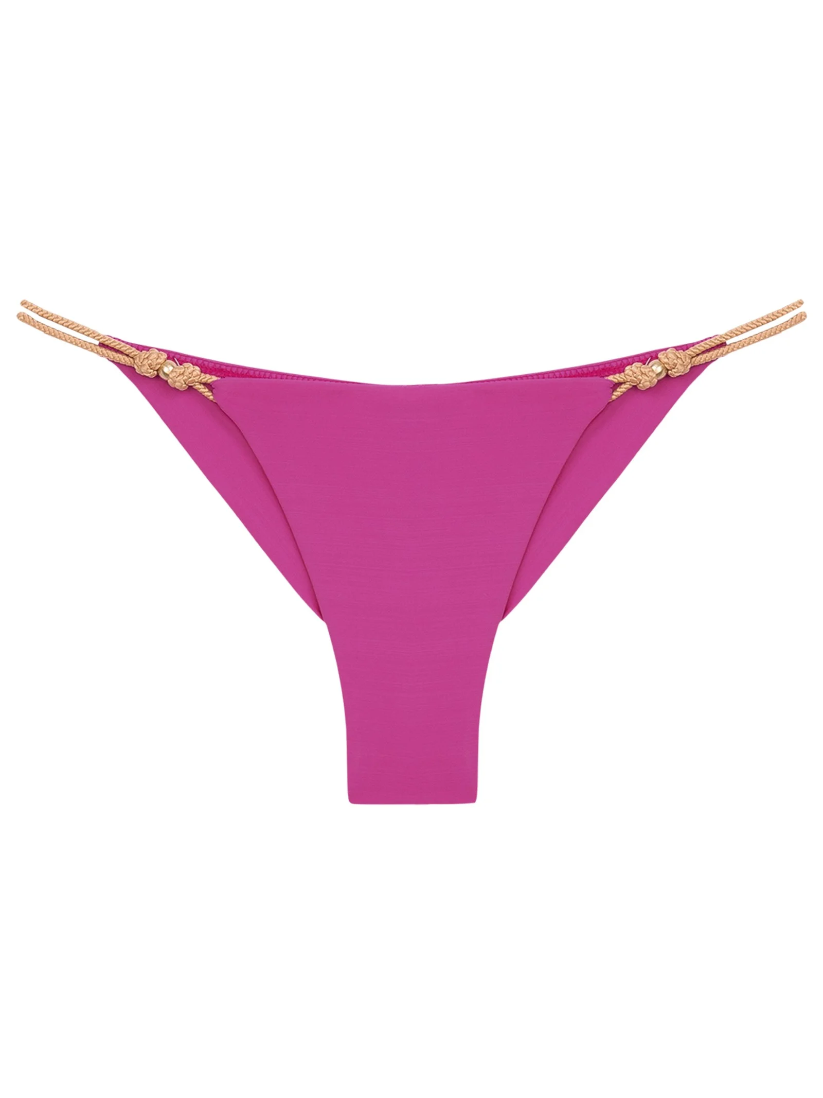 A calcinha rosa é confeccionada em malha. A peça de modelo tanga possui cintura baixa, tiras duplas laterais em cores contrastantes com detalhe de nó, tag da marca aplicada em metal na parte posterior, shape justo, caimento reto e acabamento pespontado.