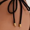 A calcinha de biquíni de lacinho preta tem amarração nas laterais. A modelagem Cheeky, com efeito “empina bumbum”, se molda perfeitamente ao corpo sem deixar excesso de tecido. Pode ser usada mais alta ou mais baixa.