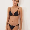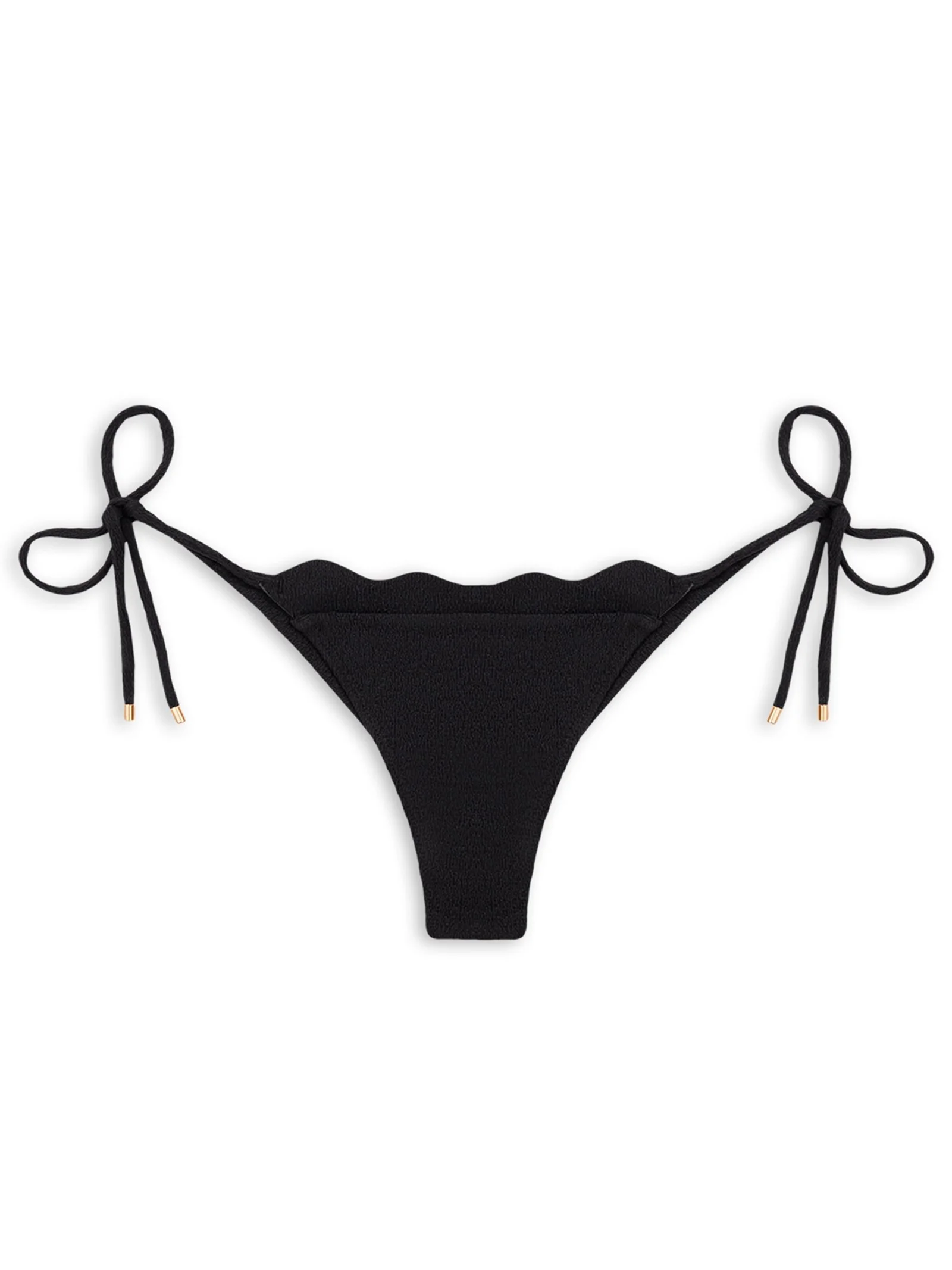 A calcinha preta é confeccionada em malha creponada com alta elasticidade. A peça de modelo string possui laterais em tiras finas estendidas para amarração com ponteiras metalizadas, tag metalizada da marca aplicada na parte posterior e forro.