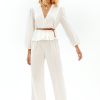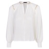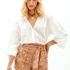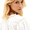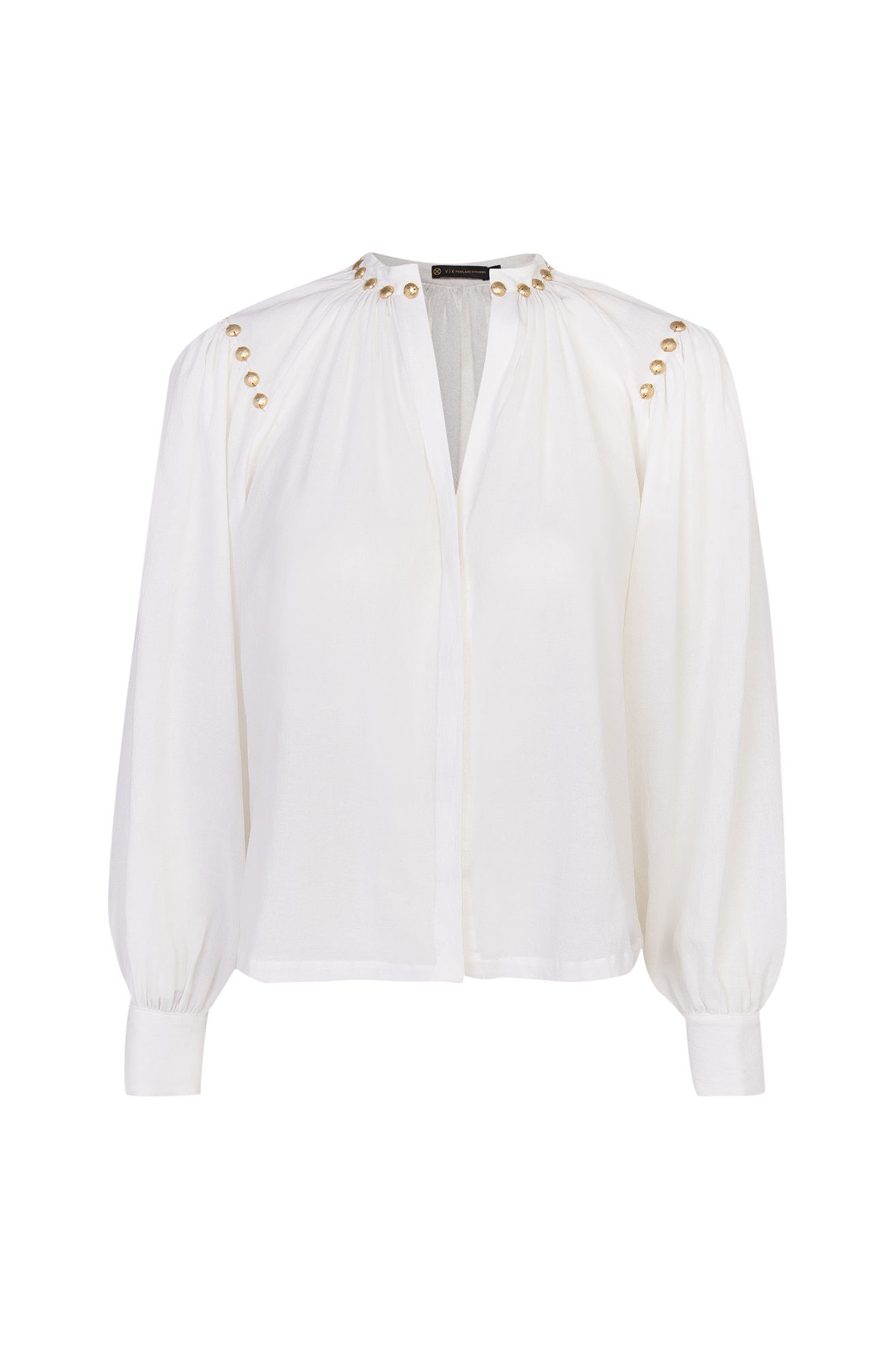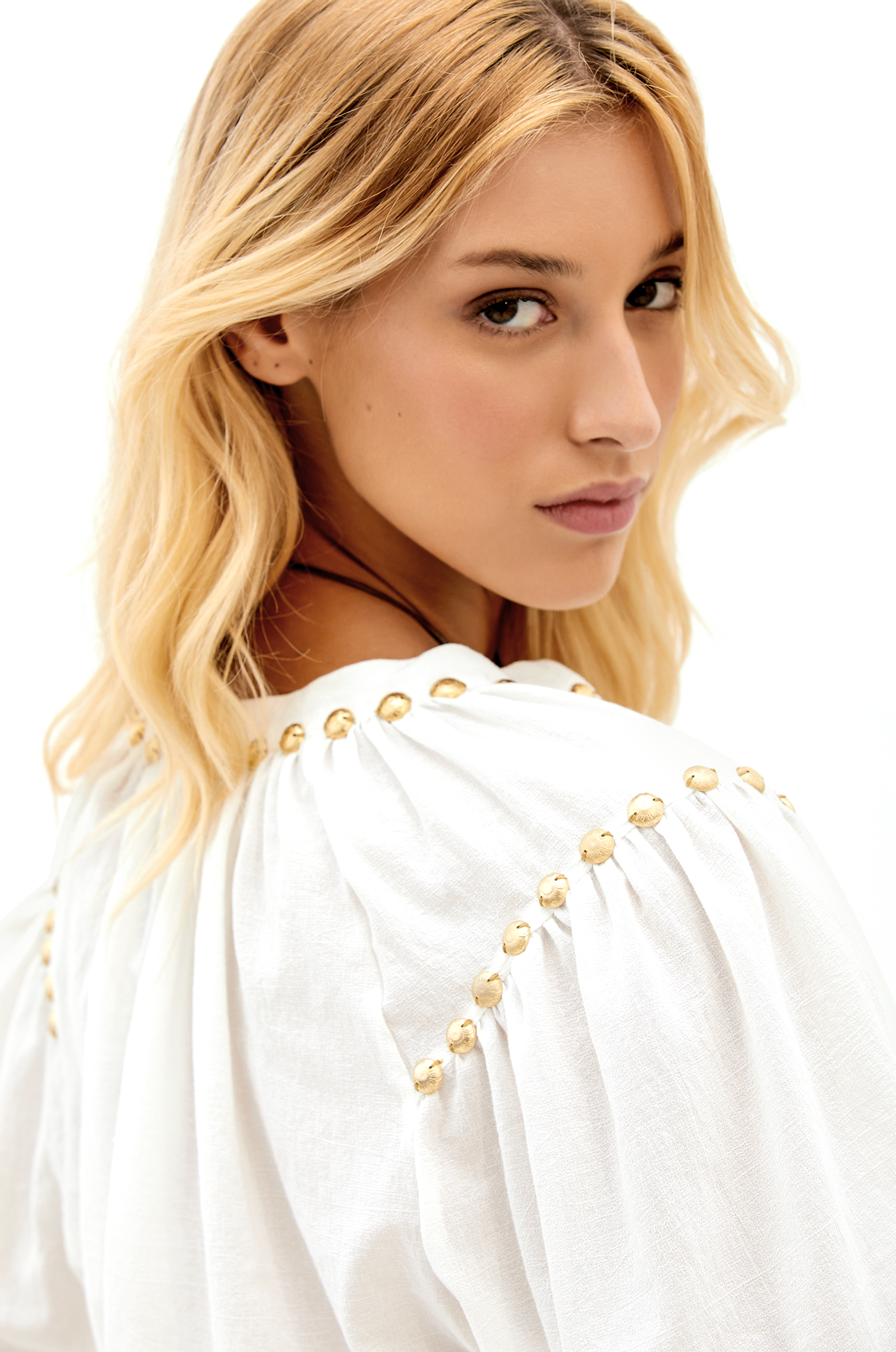 Camisa ampla em voil de algodão com maxitachas bordadas no ombro e na gola, de shape padre.